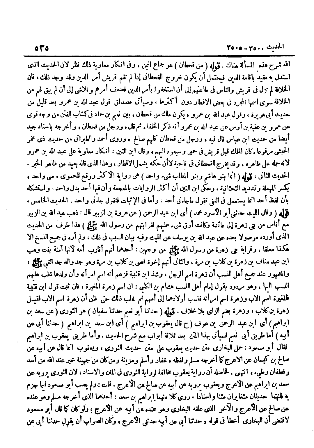 اللَّهُ شَرْحَ هَذِهِ الْمَسْأَلَةِ هُنَاكَ قَوْلُهُ مِنْ قَحْطَانَ هُوَ جِمَاعُ الْيَمَنِ وَفِي إِنْكَارِ مُعَاوِيَةَ ذَلِكَ نَظَرٌ لِأَنَّ الْحَدِيثَ الَّذِي اسْتَدَلَّ بِهِ مُقَيَّدٌ بِإِقَامَةِ الدِّينِ فَيُحْتَمَلُ أَنْ يَكُونَ خُرُوجُ الْقَحْطَانِيِّ إِذَا لَمْ تُقِمْ قُرَيْشٌ أَمْرَ الدِّينِ وَقَدْ وُجِدَ ذَلِكَ فَإِنَّ الْخِلَافَةَ لَمْ تَزَلْ فِي قُرَيْشٍ وَالنَّاسُ فِي طَاعَتِهِمْ إِلَى أَنِ اسْتَخَفُّوا بِأَمْرِ الدِّينِ فَضَعُفَ أَمْرُهُمْ وَتَلَاشَى إِلَى أَنْ لَمْ يَبْقَ لَهُمْ مِنَ الْخِلَافَةِ سِوَى اسْمِهَا الْمُجَرَّدِ فِي بَعْضِ الْأَقْطَارِ دُونَ أَكْثَرِهَا وَسَيَأْتِي مِصْدَاقُ قَوْلِ عَبْدِ اللَّهِ بْنِ عَمْرٍو بَعْدَ قَلِيلٍ مِنْ حَدِيثِ أَبِي هُرَيْرَةَ وَقَوْلُ عَبْدِ اللَّهِ بْنِ عَمْرٍو يَكُونُ مَلِكٌ مِنْ قَحْطَانَ بَيَّنَ نُعَيْمُ بْنُ حَمَّادٍ فِي كِتَابِ الْفِتَنِ مِنْ وَجْهٍ قَوِيٍّ عَنْ عَمْرِو بْنِ عُقْبَةَ بْنِ أَوْسٍ عَنْ عَبْدِ اللَّهِ بْنِ عَمْرٍو أَنَّهُ ذَكَرَ الْخُلَفَاءَ ثُمَّ قَالَ وَرَجُلٌ من قحطان وَأخرجه بِإِسْنَاد جيد عَنْ عَمْرِو بْنِ عُقْبَةَ بْنِ أَوْسٍ عَنْ عَبْدِ اللَّهِ بْنِ عَمْرٍو أَنَّهُ ذَكَرَ الْخُلَفَاءَ ثُمَّ قَالَ وَرَجُلٌ مِنْ قَحْطَانَ وَأَخْرَجَهُ بِإِسْنَادٍ جيد أَيْضا من حَدِيث بن عَبَّاسٍ قَالَ فِيهِ وَرَجُلٌ مِنْ قَحْطَانَ كُلُّهُمْ صَالِحٌ وَرَوَى أَحْمَدُ وَالطَّبَرَانِيُّ مِنْ حَدِيثِ ذِي مِخْمَرٍ الْحَبَشِيِّ مَرْفُوعًا كَانَ الْمُلْكُ قَبْلَ قُرَيْشٍ فِي حمير وَسَيَعُودُ إِلَيْهِم وَقَالَ بن التِّينِ إِنْكَارُ مُعَاوِيَةَ عَلَى عَبْدِ اللَّهِ بْنِ عمر لِأَنَّهُ حَمَلَهُ عَلَى ظَاهِرِهِ وَقَدْ يَخْرُجُ الْقَحْطَانِيُّ فِي نَاحِيَةٍ لَا أَنَّ حُكْمَهُ يَشْمَلُ الْأَقْطَارَ وَهَذَا الَّذِي قَالَهُ بَعِيدٌ مِنْ ظَاهِرِ الْخَبَرِ الْحَدِيثُ الثَّانِي