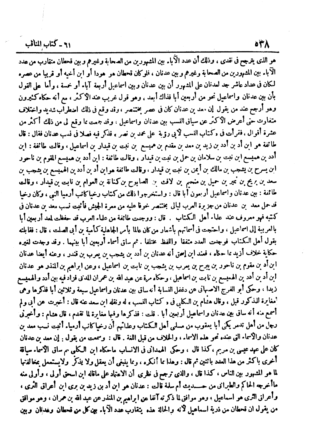 هُوَ الَّذِي يَتَرَجَّحُ فِي نَقْدِي وَذَلِكَ أَنَّ عدد الْآبَاء بَين الْمَشْهُورين من الصَّحَابَة وَغَيرهم وَبَيْنَ قَحْطَانَ مُتَقَارِبٌ مِنْ عَدَدِ الْآبَاءِ بَيْنَ الْمَشْهُورِينَ مِنَ الصَّحَابَةِ وَغَيْرِهِمْ وَبَيْنَ عَدْنَانَ فَلَوْ كَانَ قحطان هُوَ هودا أَو بن أَخِيهِ أَوْ قَرِيبًا مِنْ عَصْرِهِ لَكَانَ فِي عِدَادِ عَاشِرِ جَدٍّ لِعَدْنَانَ عَلَى الْمَشْهُورِ أَنَّ بَيْنَ عَدْنَانَ وَبَيْنَ إِسْمَاعِيلَ أَرْبَعَةَ آبَاءٍ أَوْ خَمْسَةً وَأَمَّا عَلَى الْقَوْلِ بِأَنَّ بَيْنَ عَدْنَانَ وَإِسْمَاعِيل نَحْو من أَرْبَعِينَ أَبًا فَذَاكَ أَبْعَدُ وَهُوَ قَوْلٌ غَرِيبٌ عِنْدَ الْأَكْثَرِ مَعَ أَنَّهُ حَكَاهُ كَثِيرُونَ وَهُوَ أَرْجَحُ عِنْدَ مَنْ يَقُولُ إِنَّ مَعَدَّ بْنَ عَدْنَانَ كَانَ فِي عَصْرِ بُخْتَنَصَّرَ وَقَدْ وَقَعَ فِي ذَلِكَ اضْطِرَابٌ شَدِيدٌ وَاخْتِلَافٌ مُتَفَاوِتٌ حَتَّى أَعْرَضَ الْأَكْثَرُ عَنْ سِيَاقِ النَّسَبِ بَيْنَ عَدْنَانَ وَإِسْمَاعِيلَ وَقَدْ جَمَعْتُ مِمَّا وَقَعَ لِي مِنْ ذَلِكَ أَكْثَرَ مِنْ عَشَرَةِ أَقْوَالٍ فَقَرَأْتُ فِي كِتَابِ النَّسَبِ لِأَبِي رُؤْبَةَ عَلَى مُحَمَّدِ بْنِ نَصْرٍ فَذَكَرَ فِيهِ فَصْلًا فِي نَسَبِ عَدْنَانَ فَقَالَ قَالَت طَائِفَة هُوَ بن أدبن أَدَدِ بْنِ زَيْدِ بْنِ مَعَدِّ بْنِ مُقَدَّمِ بْنِ هَمَيْسَعَ بْنِ نَبْتِ بْنَ قَيْدَارَ بْنِ إِسْمَاعِيل وَقَالَت طَائِفَة بن أَدَدِ بْنِ هَمَيْسَعَ بْنِ نَبْتِ بْنِ سَلَامَانَ بْنِ حَمَلَ بْنِ نَبْتِ بْنِ قَيْدَارَ وَقَالَتْ طَائِفَة بن أَدَدِ بْنِ هَمَيْسَعَ الْمُقَوِّمِ بْنِ نَاحُورَ بْنِ يَسْرَحَ بْنِ يَشْجُبَ بْنِ مَالِكَ بْنِ أَيْمَنَ بْنِ نَبْتِ بْنِ قَيْدَارَ وَقَالَتْ طَائِفَةٌ هُوَ بْنُ أُدِّ بْنِ أَدَدِ بْنِ الْهَمَيْسَعِ بْنِ يَشْجُبَ بْنِ سَعْدِ بْنِ بَرِيحِ بْنِ نُمَيْرِ بْنِ حَمِيلِ بْنِ مَنْحِيمَ بْنِ لَافِثَ بْنِ الصَّابُوحِ بْنِ كِنَانَةَ بْنِ الْعَوَّامِ بْنِ نَابِتَ بْنِ قَيْدَارَ وَقَالَتْ طَائِفَةٌ بَيْنَ عَدْنَانَ وَإِسْمَاعِيلَ أَرْبَعُونَ أَبًا قَالَ وَاسْتَخْرَجُوا ذَلِكَ مِنْ كِتَابِ رَخِيَا كَاتِبِ أَرْمِيَا النَّبِيِّ وَكَانَ رَخِيَا قَدْ حَمَلَ مَعَدَّ بْنَ عَدْنَانَ مِنْ جَزِيرَةِ الْعَرَبِ لَيَالِيَ بُخْتَنَصَّرَ خَوْفًا عَلَيْهِ مِنْ مَعَرَّةِ الْجَيْشِ فَأَثْبَتَ نَسَبَ مَعَدِّ بْنِ عَدْنَانَ فِي كُتُبِهِ فَهُوَ مَعْرُوفٌ عِنْدَ عُلَمَاءِ أَهْلِ الْكِتَابِ قَالَ وَوَجَدْتُ طَائِفَةً مِنْ عُلَمَاءِ الْعَرَبِ قَدْ حَفِظَتْ لِمَعَدَّ أَرْبَعِينَ أَبًا بِالْعَرَبِيَّةِ إِلَى إِسْمَاعِيلَ وَاحْتَجَّتْ فِي أَسْمَائِهِمْ بِأَشْعَارِ مَنْ كَانَ عَالِمًا بِأَمْرِ الْجَاهِلِيَّةِ كَأُمَيَّةِ بْنِ أَبِي الصَّلْتِ قَالَ فَقَابَلْتُهُ بِقَوْلِ أَهْلِ الْكِتَابِ فَوَجَدْتُ الْعَدَدَ مُتَّفِقًا وَاللَّفْظُ مُخْتَلِفًا ثُمَّ سَاقَ أَسْمَاءَ أَرْبَعِينَ أَبًا بَيْنَهُمَا وَقَدْ وَجَدْتُ لِغَيْرِهِ حِكَايَةَ خِلَافٍ أَزْيَدَ مِمَّا حَكَاهُ فَعِنْدَ بن إِسْحَاقَ أَنَّهُ عَدْنَانُ بْنُ أَدَدِ بْنِ يَشْجُبَ بْنِ يَعْرُبَ بْنِ قَنْدَرَ وَعَنْهُ أَيْضًا عَدْنَانُ بْنُ أُدِّ بْنِ مُقَوِّمِ بْنِ نَاحُورَ بْنِ يَبْرَحَ بْنِ يَعْرُبَ بْنِ يَشْجُبَ بْنِ نَابِتِ بْنِ إِسْمَاعِيلَ وَعَنْ إِبْرَاهِيمَ بْنِ الْمُنْذِرِ هُوَ عَدْنَانُ بْنُ أُدِّ بْنِ أَدَدِ بْنِ الْهَمَيْسَعِ بْنِ نَابِتِ بْنِ إِسْمَاعِيلَ وَحَكَاهُ مُرَّةُ عَنْ عَبْدِ اللَّهِ بْنِ عِمْرَانَ الْمَدَنِيِّ فَزَادَ فِيهِ بَيْنَ أَدَدٍ وَالْهَمَيْسَعِ زَيْدًا وَحَكَى أَبُو الْفَرَجِ الْأَصْبِهَانِيُّ عَنْ دَغْفَلٍ النَّسَّابَةِ أَنَّهُ سَاقَ بَيْنَ عَدْنَانَ وَإِسْمَاعِيلَ سَبْعَةً 
