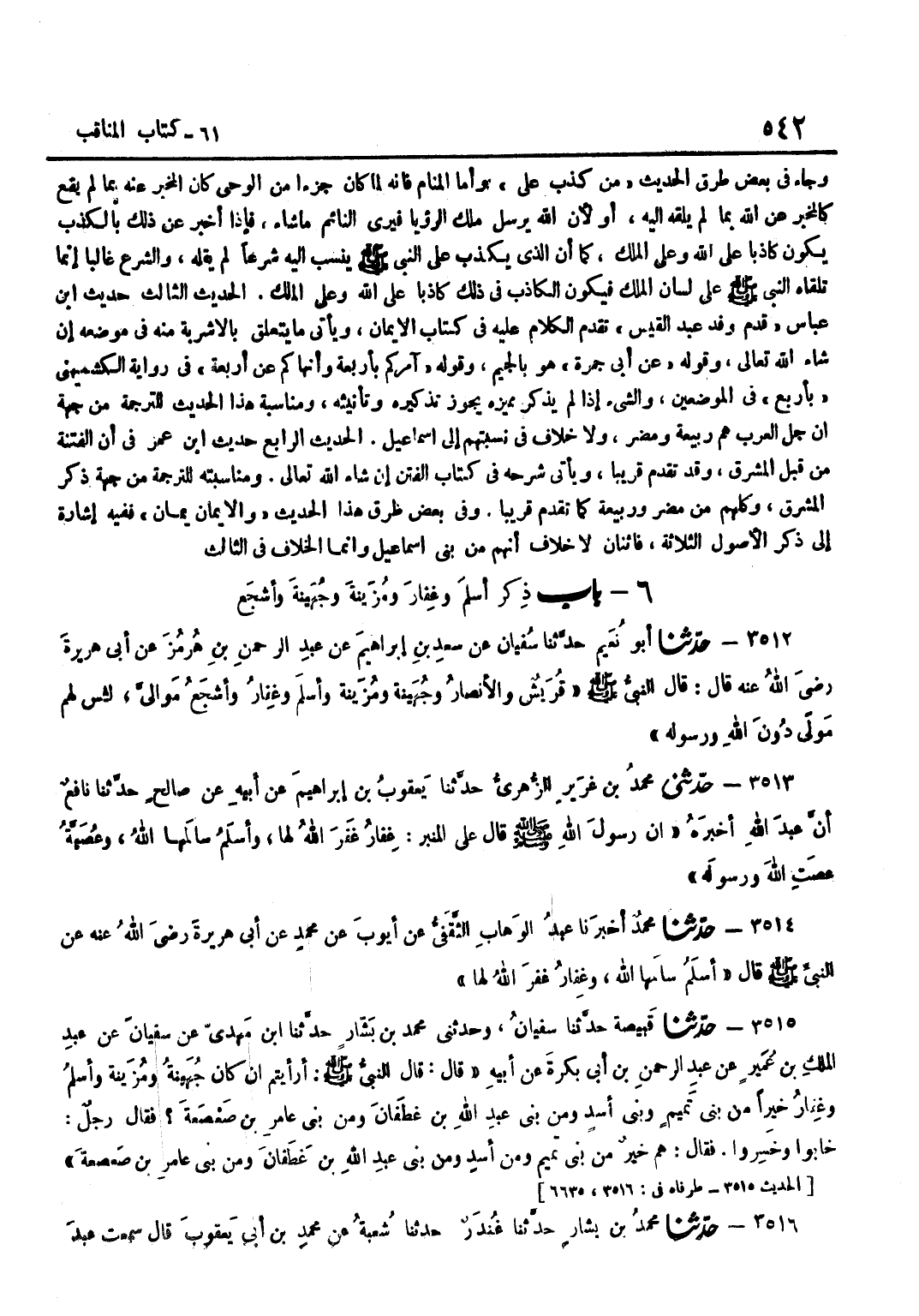 [3510] عَنْ أَبِي جَمْرَةَ هُوَ بِالْجِيمِ وَقَوْلُهُ آمُرُكُمْ بِأَرْبَعَةٍ وَأَنْهَاكُمْ عَنْ أَرْبَعَةٍ فِي رِوَايَةِ الْكُشْمِيهَنِيِّ بِأَرْبَعٍ فِي الْمَوْضِعَيْنِ وَالشَّيْءُ إِذَا لَمْ يُذْكَرْ مُمَيِّزُهُ يَجُوزُ تَذْكِيرُهُ وَتَأْنِيثُهُ وَمُنَاسَبَةُ هَذَا الْحَدِيثِ لِلتَّرْجَمَةِ مِنْ جِهَةِ أَنَّ جُلَّ الْعَرَبِ هُمْ رَبِيعَةُ وَمُضَرُ وَلَا خِلَافَ فِي نسبتهم إِلَى إِسْمَاعِيل الحَدِيث الرَّابِع حَدِيث بن عُمَرَ فِي أَنَّ الْفِتْنَةَ مِنْ قِبَلِ الْمَشْرِقِ وَقَدْ تَقَدَّمَ قَرِيبًا وَيَأْتِي شَرْحُهُ فِي كِتَابِ الْفِتَنِ إِنْ شَاءَ اللَّهُ تَعَالَى وَمُنَاسَبَتُهُ لِلتَّرْجَمَةِ مِنْ جِهَةِ ذِكْرِ الْمَشْرِقِ وَكُلُّهُمْ مِنْ مُضَرَ وَرَبِيعَةَ كَمَا تَقَدَّمَ قَرِيبًا وَفِي بَعْضِ طُرُقِ هَذَا الْحَدِيثِ وَالْإِيمَانُ يَمَانٍ فَفِيهِ إِشَارَةٌ إِلَى ذِكْرِ الْأُصُولِ الثَّلَاثَةِ فَاثْنَانِ لَا خِلَافَ أَنَّهُمْ مِنْ بَنِي إِسْمَاعِيلَ وَإِنَّمَا الْخِلَافُ فِي الثَّالِثِ