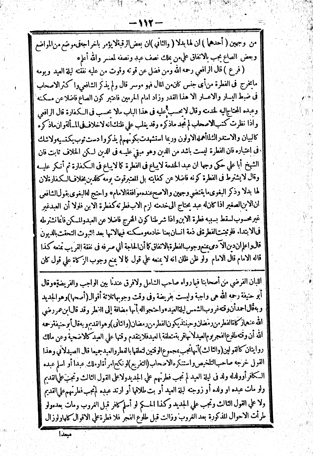 اللبان الفرضي من أصحابنا فيما رواه صاحب الشامل ولا فرق عندنا بين الواجب والفريضة * وقال أبو حنيفة رحمه الله هي واجبة وليست بفريضة وفى وقت وجوبها ثلاثة أقوال (أصحها) وهو الجديد وبه قال احمد أن وقته غروب الشمس ليلة العيده واحتجوا له بأنها مضافة إلى الفطر وقد قال ابن عمر رضي الله عنهما زكاة الفطر من رمضان وحينئذ يكون الفطر من رمضان (والثانى) وهو القديم وبه قال أبو حنيفة رحمه الله أن وقته طلوع الفجر يوم العيد لانها قربة متعلقة بالعيد فلا يتقدم وقتها علي العيد كالاضحية وعن مالك روايتان كالقولين (والثالث) أنها تجب بمجموع الوقتين لتعلقها بالفطر والعيد جميعا قال الصيدلاني وهذا القول خرجه صاحب التلخيص واستنكره الاصحاب (التفريع) لو نكح امرأة أو ملك عبدا أو اسلم عبده الكافر أو ولد له ولد في ليلة العيد لم تجب فطرتهم علي الجديد ولا على القول الثالث وتجب علي القديم ولو مات عبده أو ولده أو زوجته ليلة العيد أو بت طلاقها أو ارتد عبده لم تجب فطرتهم علي القديم ولا علي القول الثالث وتجب علي الجديد وكذا الحكم لو أسلم كافر قبل الغروب ومات بعده ولو طرأت الاحوال المذكورة بعد الغروب وزالت قبل طلوع الفجر فلا فطرة علي الاقوال كلها ولو زال