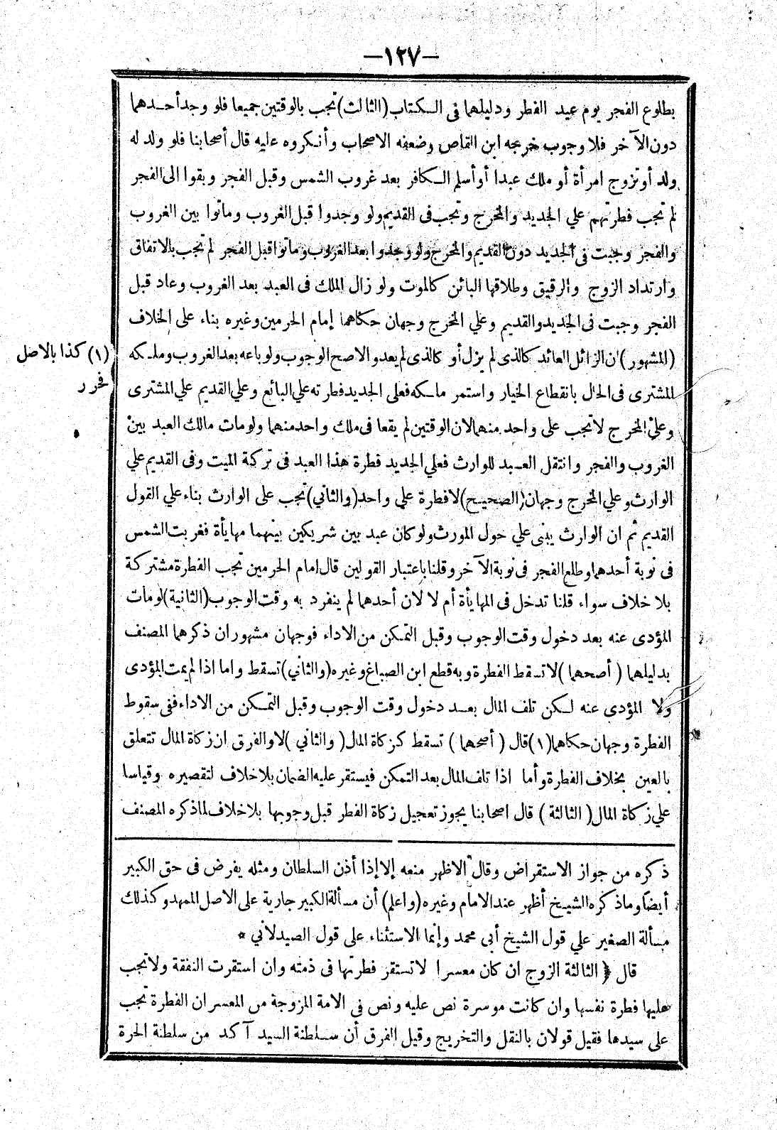 ذكره من جواز الاستقراض وقال الاظهر منعه إلا إذا أذن السلطان ومثله يفرض في حق الكبير أيضا وما ذكره الشيخ أظهر عند الامام وغيره (واعلم) أن مسألة الكبير جارية على الاصل الممهد وكذلك مسألة الصغير علي قول الشيخ أبى محمد وإنما الاستثناء على قول الصيدلاني * قال (الثالثة الزوج ان كان معسرا لا تستقر فطرتها في ذمته وان استقرت النفقة ولا تجب عليها فطرة نفسها وان كانت موسرة نص عليه ونص في الامة المزوجة من المعسر ان الفطرة تجب على سيدها فقيل قولان بالنقل والتخريج وقيل الفرق أن سلطنة السيد آكد من سلطنة الحرة