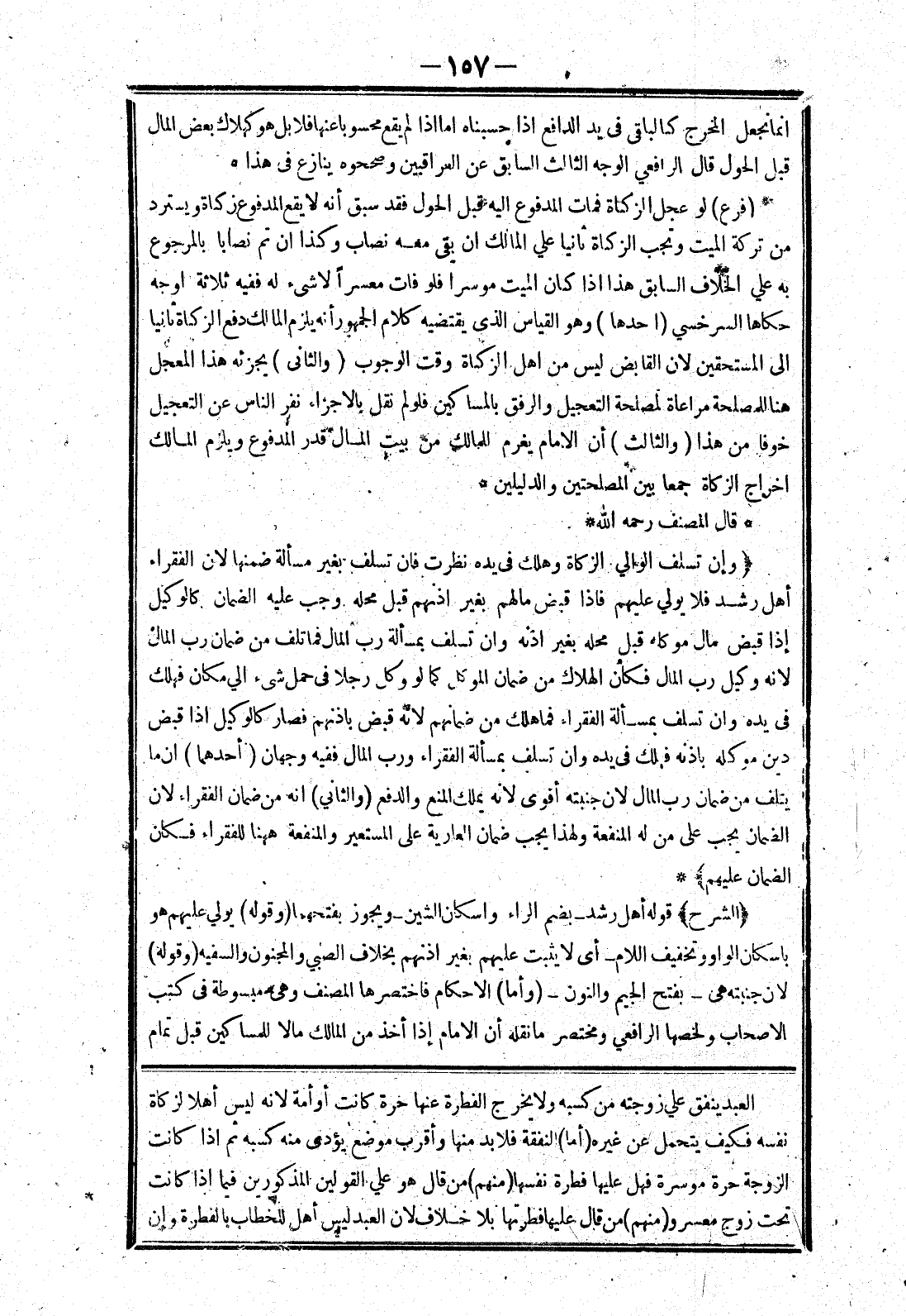 العبد ينفق علي زوجته من كسبه ولا يخرج الفطرة عنها حرة كانت أو أمة لانه ليس أهلا لزكاة نفسه فكيف يتحمل عن غيره (أما) النفقة فلابد منها وأقرب موضع يؤدى منه كسبه ثم إذا كانت الزوجة حرة موسرة فهل عليها فطرة نفسها (منهم) من قال هو علي القولين المذكورين فيما إذا كانت تحت زوج معسر و (منهم) من قال عليها فطرتها بلا خلاف لان العبد ليس أهل للخطاب بالفطرة وإن