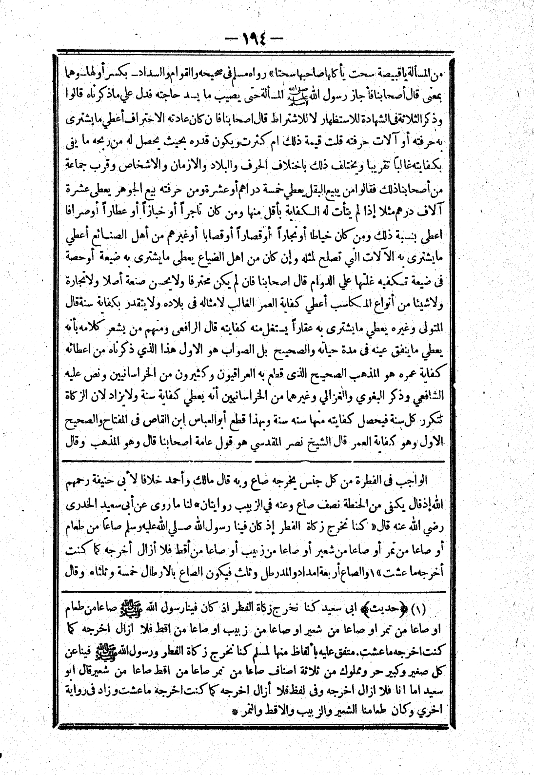 الواجب في الفطرة من كل جنس يخرجه صاع وبه قال مالك وأحمد خلافا لابي حنيفة رحمهم الله إذ قال يكفى من الحنطة نصف صاع وعنه في الزبيب روايتان * لنا ما روى عن أبى سعيد الخدرى رضي الله عنه قال " كنا نخرج زكاة الفطر إذ كان فينا رسول الله صلي الله عليه وسلم صاعا من طعام أو صاعا من تمر أو صاعا من شعير أو صاعا من زبيب أو صاعا من أقط فلا أزال أخرجه كما كنت أخرجه ما عشت " 1 والصاع أربعة امداد والمد رطل وثلث فيكون الصاع بالارطال خمسة وثلثا * وقال
