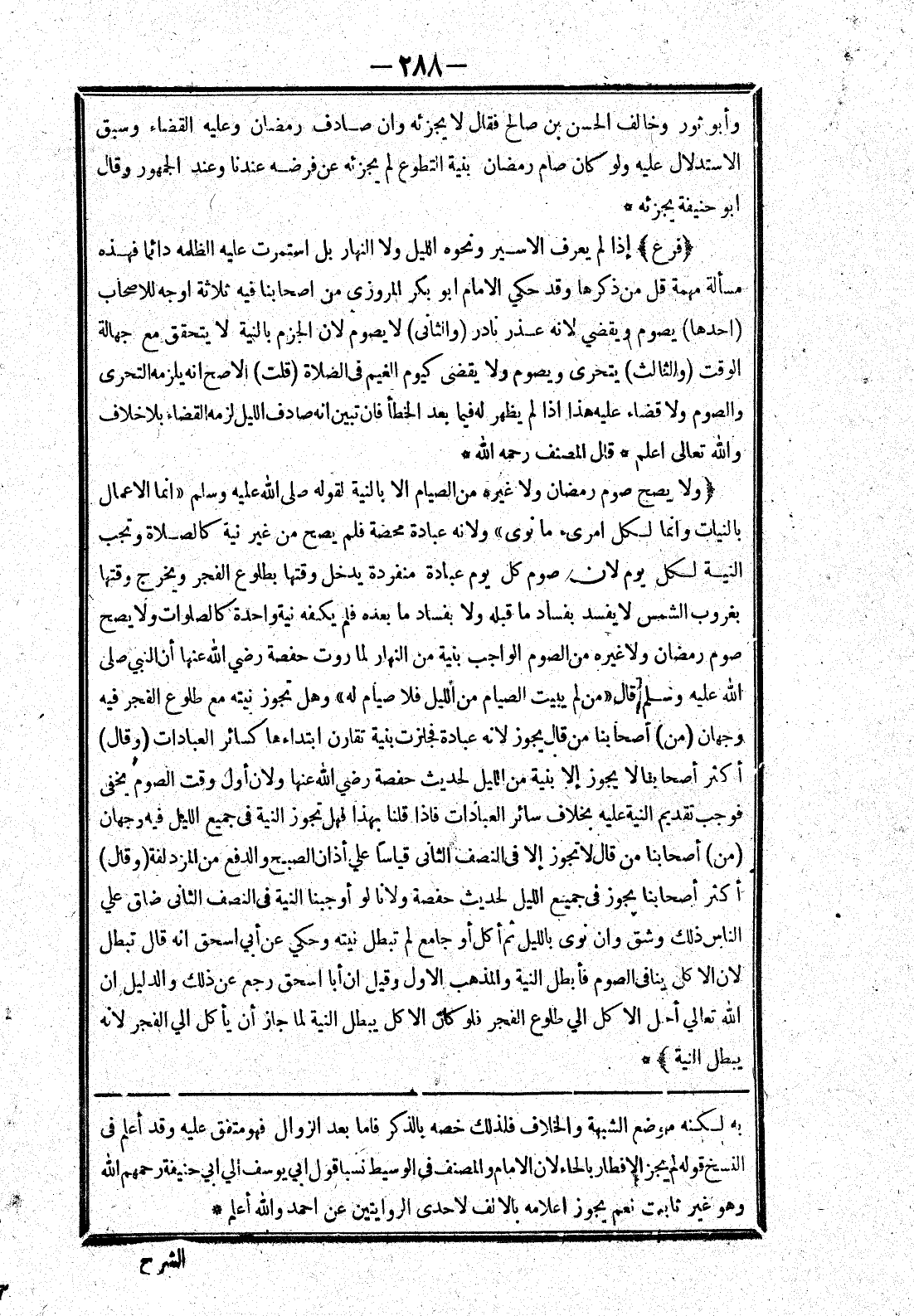 به لكنه موضع الشبهة والخلاف فلذلك خصه بالذكر فاما بعد الزوال فهو متفق عليه وقد أعلم في النسخ قوله لم يجز الافطار بالحاء لان الامام والمصنف في الوسيط نسبا قول ابي يوسف الي ابي حنيفة رحمهم الله وهو غير ثابت نعم يجوز اعلامه بالالف لاحدى الروايتين عن احمد والله أعلم *