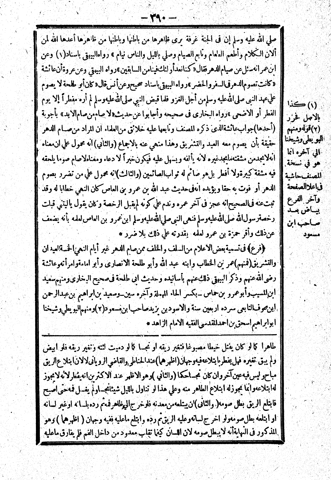 طاهرا كما لو كان يفتل خيطا مصبوغا فتغير ريقه أو نجسا كما لو دميت لثته وتغير ريقه فلو ابيض ولم يبق تغيره فهل يفطر بابتلاعه فيه وجهان (اظهرهما) عند الحناطى والقاضي الرويانى لا لان ابتلاع الريق مباح وليس فيه عين آخر وان كان نجسا حكما (والثاني) وهو الاظهر عند الاكثرين انه يفطر لانه لا يجوز له ابتلاعه وانما يجوز له ابتلاع الطاهر منه وعلي هذا لو تناول بالليل شيئا نجسا ولم يغسل فمه حتى اصبح فابتلع الريق بطل صومه (والثانى) ان يبتلعه من معدنه فلو خرج الي ظاهر فمه ثم رده بلسانه أو غير لسانه أو ابتلعه بطل صومه ولو اخرج لسانه وعليه الريق ثم رده وابتلع ما عليه ففيه وجهان (اظهرهما) وهو المذكور في النهاية أنه لا يبطل صومه لان اللسان كيفما تقلب معدود من داخل الفم فلم يفارق ما عليه