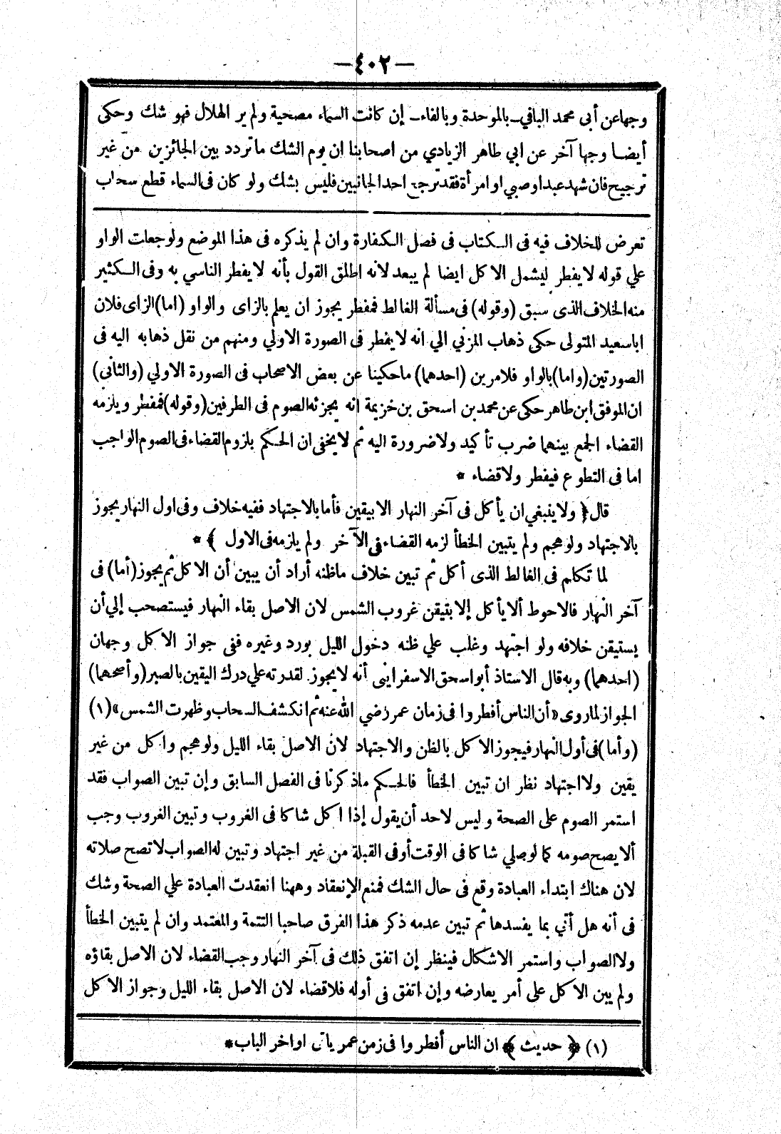 علي قوله لا يفطر ليشمل الاكل ايضا لم يبعد لانه اطلق القول بأنه لا يفطر الناسي به وفى الكثير منه الخلاف الذى سبق (وقوله) في مسألة الغالط فمفطر يجوز ان يعلم بالزاى والواو (اما) الزاى فلان ابا سعيد المتولي حكى ذهاب المزني الي انه لا يفطر في الصورة الاولي ومنهم من نقل ذهابه إليه في الصورتين (واما) بالواو فلامرين (احدهما) ما حكينا عن بعض الاصحاب في الصورة الاولي (والثانى) ان الموفق ابن طاهر حكى عن محمد بن اسحق بن خزيمة انه يجزئه الصوم في الطرفين (وقوله) فمفطر ويلزمه القضاء الجمع بينهما ضرب تأكيد ولا ضرورة إليه ثم لا يخفى ان الحكم بلزوم القضاء في الصوم الواجب اما في التطوع فيفطر ولا قضاء * قال {ولا ينبغي ان يأكل في آخر النهار الا بيقين فأما بالاجتهاد ففيه خلاف وفى اول النهار يجوز بالاجتهاد ولو هجم ولم يتبين الخطأ لزمه القضاء في الآخر ولم يلزمه في الاول} * لما تكلم في الغالط الذى أكل ثم تبين خلاف ما ظنه أراد أن يبين أن الاكل ثم يجوز (أما) في آخر النهار فالاحوط ألا يأكل إلا بتيقن غروب الشمس لان الاصل بقاء النهار فيستصحب إلي أن يستيقن خلافه ولو اجتهد وغلب علي ظنه دخول الليل بورد وغيره ففى جواز الاكل وجهان (احدهما) وبه قال الاستاذ أبو إسحق الاسفراينى أنه لا يجوز لقدرته علي درك اليقين بالصبر (وأصحهما) الجواز لما روى " أن الناس أفطروا في زمان عمر رضي الله ثم انكشف السحاب وظهرت الشمس " (وأما) في أول النهار فيجوز الاكل بالظن والاجتهاد لان الاصل بقاء الليل ولو هجم واكل من غير يقين ولا اجتهاد نظر ان تبين الخطأ فالحكم ما ذكرنا في الفصل السابق وإن تبين الصواب فقد استمر الصوم على الصحة وليس لاحد أن يقول إذا اكل شاكا في الغروب وتبين الغروب وجب ألا يصح صومه كما لو صلي شاكا في الوقت أو في القبلة من غير اجتهاد وتبين له الصواب لا تصح صلاته لان هناك ابتداء العبادة وقع في حال الشك فمنع الانعقاد وههنا انعقدت العبادة علي الصحة وشك في أنه هل أتي بما يفسدها ثم تبين عدمه ذكر هذا الفرق صاحبا التتمة والمعتمد وان لم يتبين الخطأ ولا الصواب واستمر الاشكال فينظر إن اتفق ذلك في آخر النهار وجب القضاء لان الاصل بقاؤه ولم يبن الاكل على أمر يعارضه وإن اتفق في أوله فلا قضاء لان الاصل بقاء الليل وجواز الاكل