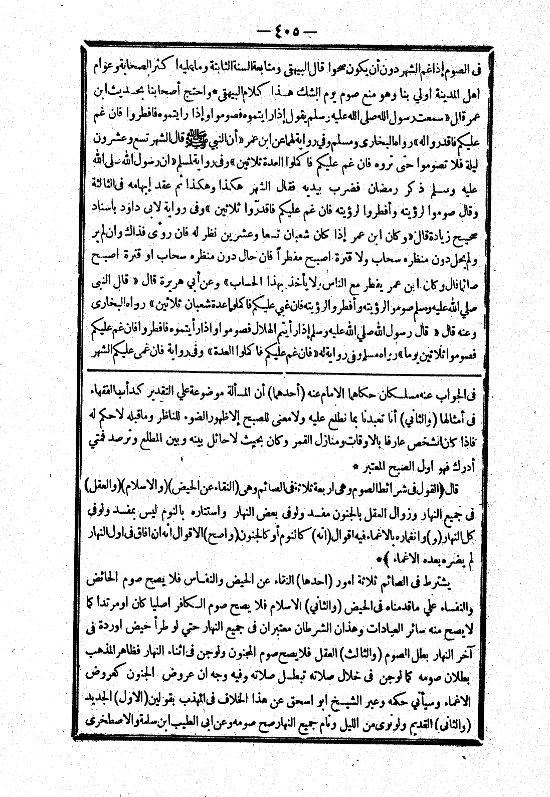 في الجواب عنه مسلكان حكاهما الامام عنه (أحدهما) أن المسألة موضوعة علي التقدير كدأب الفقهاء في أمثالها (والثاني) أنا تعبدنا بما نطلع عليه ولا معنى للصبح إلا ظهور الضوء للناظر وما قبله لا حكم له فإذا كان الشخص عارفا بالاوقات ومنازل القمر وكان بحيث لا حائل بينه وبين المطلع وترصد فمتي أدرك فهو اول الصبح المعتبر * قال {القول في شرائط الصوم وهى اربعة ثلاثة في الصائم وهى (النقاء عن الحيض) (والاسلام) (والعقل) في جميع النهار وزوال العقل بالجنون مفسد ولو في بعض النهار واستتاره بالنوم ليس بمفسد ولو في كل النهار (و) وانغماره بالاغماء فيه اقوال (انه) كالنوم أو كالجنون (واصح) الاقوال انه ان افاق في اول النهار لم يضره بعده الاغماء} * يشترط في الصائم ثلاثة امور (احدها) النقاء عن الحيض والنفاس فلا يصح صوم الحائض والنفساء علي ما قدمناه في الحيض (والثاني) الاسلام فلا يصح صوم الكافر اصليا كان أو مرتدا كما لا يصح منه سائر العبادات وهذان الشرطان معتبران في جميع النهار حتي لو طرأ حيض أو ردة في آخر النهار بطل الصوم (والثالث) العقل فلا يصح صوم المجنون ولو جن في اثناء النهار فظاهر المذهب بطلان صومه كما لو جن في خلال صلاته تبطل صلاته وفيه وجه ان عروض الجنون كعروض