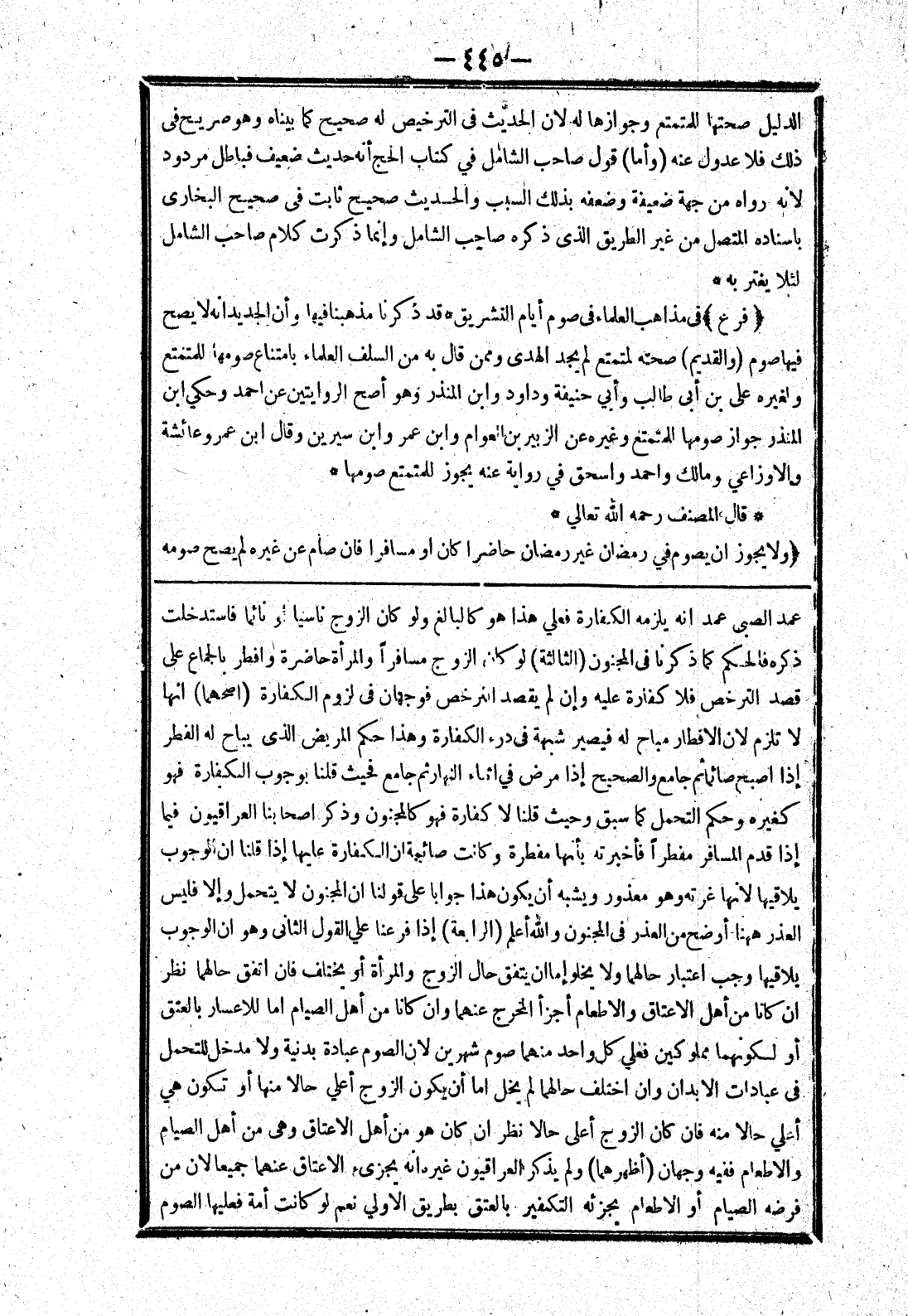 عمد الصبى عمد انه يلزمه الكفارة فعلي هذا هو كالبالغ ولو كان الزوج ناسيا أو نائما فاستدخلت ذكره فالحكم كما ذكرنا في المجنون (الثالثة) لو كان الزوج مسافرا والمرأة حاضرة وافطر بالجماع على قصد الترخص فلا كفارة عليه وإن لم نقصد الترخص فوجهان في لزوم الكفارة (اصحهما) انها لا تلزم لان الافطار مباح له فيصير شبهة في درء الكفارة وهذا حكم المريض الذى يباح له الفطر إذا اصبح صائما ثم جامع والصحيح إذا مرض في اثاء النهار ثم جامع فحيث قلنا بوجوب الكفارة فهو كغيره وحكم التحمل كما سبق وحيث قلنا لا كفارة فهو كالمجنون وذكر اصحابنا العراقيون فيما إذا قدم المسافر مفطرا فأخبرته بأنها مفطرة وكانت صائمة ان الكفارة عليها إذا قلنا ان الوجوب يلاقيها لانها غرته وهو معذور ويشبه أن يكون هذا جوابا على قولنا ان المجنون لا يتحمل وإلا فليس العذر ههنا أوضح من العذر في المجنون والله أعلم (الرابعة) إذا فرعنا علي القول الثاني وهو ان الوجوب يلاقيها وجب اعتبار حالهما ولا يخلو إما ان يتفق حال الزوج والمرأة أو يختلف فان اتفق حالهما نظر ان كانا من أهل الاعتاق والاطعام أجزأ المخرج عنهما وان كانا من أهل الصيام اما للاعسار بالعتق أو لكونهما مملوكلين فعلي كل واحد منهما صوم شهرين لان الصوم عبادة بدنية ولا مدخل للتحمل في عبادات الابدان وان اختلف حالهما لم يخل اما أن يكون الزوج أعلي حالا منها أو تكون هي أعلي حالا منه فان كان الزوج أعلى حالا نظر ان كان هو من أهل الاعتاق وهى من أهل الصيام والاطعام ففيه وجهان (أظهرهما) ولم يذكر العراقيون غيره انه يجزئ الاعتاق عنهما جميعا لان من فرضه الصيام أو الاطعام يجزئه التكفير بالعتق بطريق الاولي نعم لو كانت أمة فعليها الصوم
