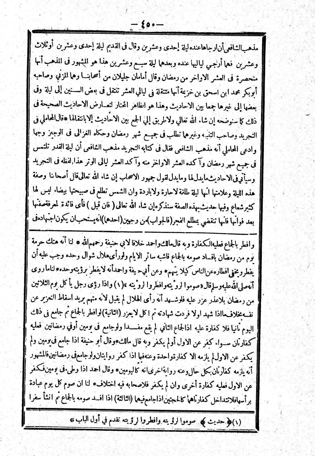وافطر بالجماع فعليه الكفارة وبه قال مالك واحمد خلافا لابي حنيفة رحمهم الله * لنا أنه هتك حرمة يوم من رمضان بافساد صومه بالجماع فاشبه سائر الايام ولو رأى هلال شوال وحده وجب عليه أن يفطر ويخفى افطاره عن الناس كيلا يتهم * وعن أبي حنيفة واحمد أنه لا يفطر برؤيته وحده * لنا ما روى أنه صلى الله عليه وسلم قال " صوموا لرؤيته وافطروا لرؤيته " وإذا رؤى رجل يأكل يوم الثلاثين من رمضان بلا عذر عزر عليه فلو شهد أنه رأى الهلال لم يقبل لانه متهم يريد اسقاط التعزير عن نفسه بخلاف ما إذا شهد اولا فردت شهادته نم اكل لا يعزر (الثانية) لو افطر بالجماع ثم جامع في ذلك اليوم ثانيا فلا كفارة عليه إذ الجماع الثاني لم يقع مفسدا ولو جامع في يومين أوفي رمضانين فعليه كفارتان سواء كفر عن الاول أو لم يكفر وبه قال مالك * وقال ابو حنيفة إذا جامع في يومين ولم يكفر عن الاول لم يلزمه الا كفارة واحدة وعنه فيما إذا كفر روايتان ولو جامع في رمضانين فالمشهور أنه يلزمه كفارتان بكل حال وعنه رواية اخرى انه كاليومين * وقال احمد إذا وطئ في يومين فكفر عن الاول فعليه كفارة أخرى وان لم يكفر فلاصحابه فيه اختلاف * لنا ان صوم كل يوم عبادة برأسها فلا تتداخل كفارتاهما كالحجتين إذا جامع فيهما (الثالثة) إذا افسد صومه بالجماع ثم انشأ سفرا