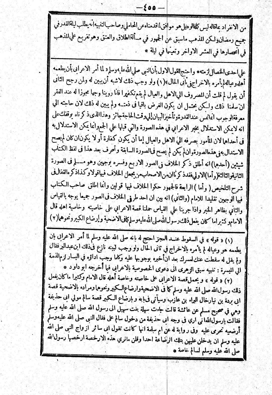 أن يقول لم قلت أن المصروف الي الاهل والعيال لم يقع تكفيرا فانا روينا وجها مجوزا عند الفقر ان سلمنا ذلك ولكن يحتمل ان يكون الغرض باقيا في ذمته ولم يبين له ذلك لان حاجته الي معرفة الوجوب انما تمس عند القدرة وتأخير البيان إلي وقت الحاجة جائز وهذا الذى ذكرناه يوقفك على انه لا يمكن الاستدلال بخبر الاعرابي في هذه الصورة والتي قبلها علي الجمع وانما يمكن الاستدلال به في أحداهما لان المأمور بصرفه الي الاهل والعيال إما أن يكون كفارة أو لا يكون ان كان لم يصح الاستدال به في هذه الصورة وان لم يكن لم يصح في الصورة السابقة وأعرف بعد هذا في لفظ الكتاب شيئين (أحدهما) انه أطلق ذكر الخلاف في الصور الاربع وفسره بوجهين وهو مسلم في الصورة الثانية والثالثة (وأما) الاولي فقد ذكرنا ان من الاصحاب من يجعل الخلاف فيها قولا وكذا ذكره القفال في شرح التلخيص (وأما) الرابعة فالجمهور حكوا الخلاف فيها قولين وانما اطلق صاحب الكتاب فيها الوجهين تقليدا للامام (والثانى) انه بين ان احد طرفي الخلاف في الصور جميعا يوجه بالقياس والثاني بظاهر الخبر وإذا جرينا علي القياس حملنا قصة الاعرابي على خاصيته وخاصية اهله قال الامام وكثيرا ماكان يفعل ذلك رسول الله صلى الله عليه وسلم كما في الاضحية وإرضاع الكبير ونحوهما