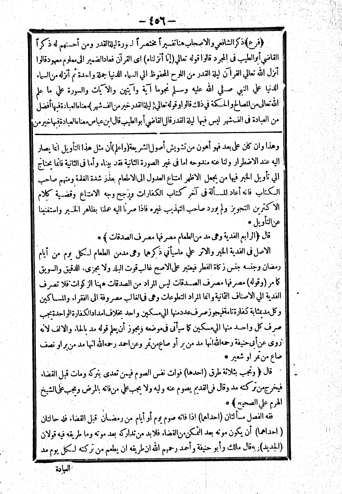 وهذا وان كان على بعد فهو أهون من تشويش أصول الشريعة (واعلم) أن مثل هذا التأويل انما يصار إليه عند الاضطرار ولنا عنه مندوحه اما في غير الصورة الثانية فقد بيناه وأما في الثانية فانما يحتاج الي تأويل الخبر فيها من يجعل الاظهر امتناع العدول إلى الاطعام بعذر شدة الغلمة ومنهم صاحب الكتاب فانه أعاد المسألة في آخر كتاب الكفارات وزجح وجه الامتناع وقضية كلام الاكثرين التجويز ولم يورد صاحب التهذيب غيره فإذا صرنا إليه عملنا بظاهر الخبر واستغنينا عن التأويل * قال {الرابع الفدية وهى مد من الطعام مصرفها مصرف الصدقات} * الاصل في الفدية الخبر والاثر علي ما سياتي ذكرهما وهى مد من الطعام لكل يوم من أيام رمضان وجنسه جنس زكاه الفطر فيعتبر على الاصح غالب قوت البلد ولا يجزئ الدقيق والسويق