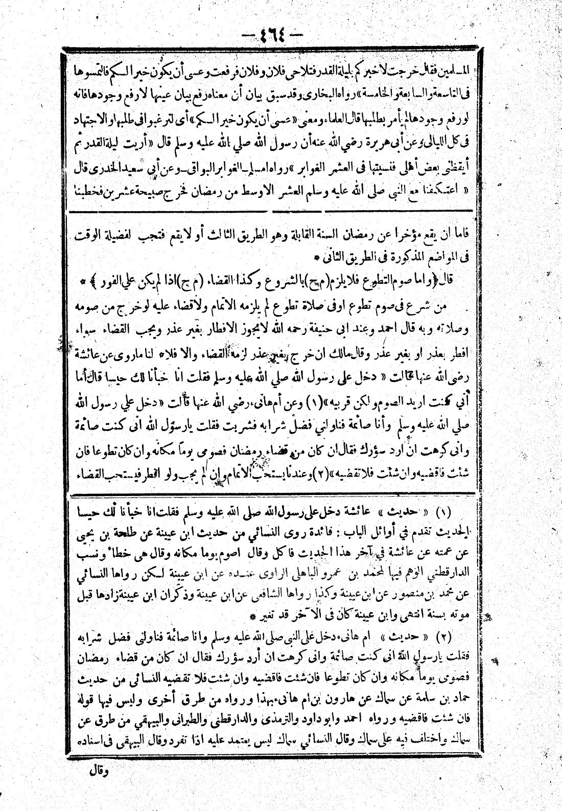 قال {واما صوم التطوع فلا يلزم (م ح) بالشروع وكذا القضاء (م ح) إذا لم يكن علي الفور} * من شرع في صوم تطوع أو في صلاة تطوع لم يلزمه الاتمام ولا قضاء عليه لو خرج من صومه وصلاته وبه قال احمد وعند ابى حنيفة رحمه الله لا يجوز الافطار بغير عذر ويجب القضاء سواء افطر بعذر أو بغير عذر وقال مالك ان خرج بغير عذر لزمه القضاء والا فلا * لنا ما روى عن عائشة رضى الله عنها قالت " دخل على رسول الله صلي الله عليه وسلم فقلت انا خبأنا لك حيسا قال أما اني كنت اريد الصوم ولكن قريبه " وعن أم هانئ رضي الله عنها قالت " دخل علي رسول الله صلي الله عليه وسلم وأنا صائمة فناولني فضل شرابه فشربت فقلت يارسول الله انى كنت صائمة وانى كرهت ان ارد سؤرك فقال ان كان من قضاء رمضان فصومي يوما مكانه وان كان تطوعا فان شئت فاقضيه وان شئت فلا تقضيه " وعندنا يستحب الاتمام وان لم يجب ولو افطر فيستحب القضاء