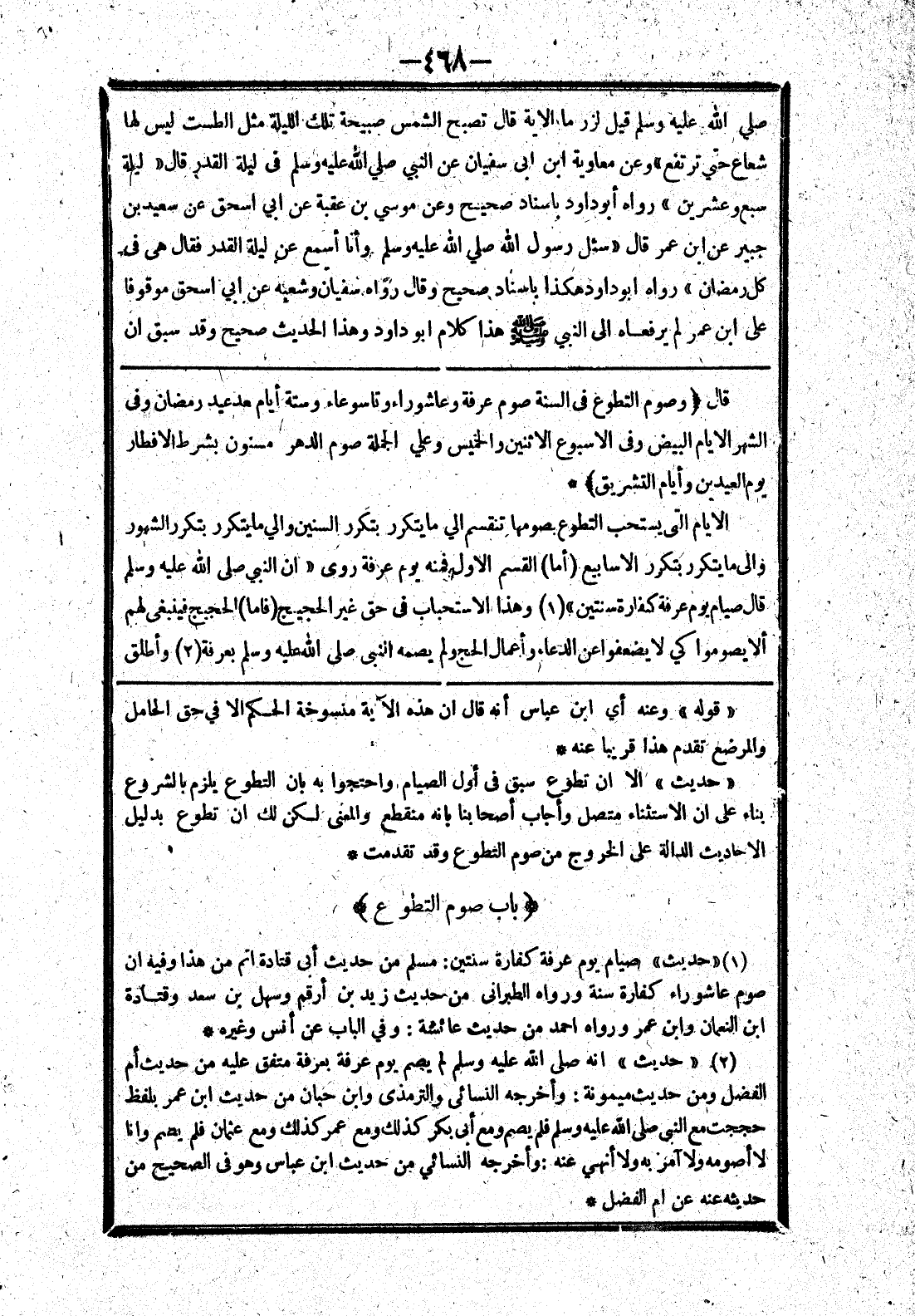 قال {وصوم التطوع في السنة صوم عرفة وعاشوراء وتاسوعاء وستة أيام بعد عيد رمضان وفى الشهر الايام البيض وفى الاسبوع الاثنين والخميس وعلي الجملة صوم الدهر مسنون بشرط الافطار يوم العيدين وأيام التشريق} * الايام التى يستحب التطوع بصومها تنقسم الي ما يتكرر بتكرر السنين والي ما يتكرر بتكرر الشهور والى ما يتكرر بتكرر الاسابيع (أما) القسم الاول فمنه يوم عرفة روى " ان النبي صلى الله عليه وسلم قال صيام يوم عرفة كفارة سنتين " وهذا الاستحباب في حق غير الحجيج (فاما) الحجيج فينبغي لهم ألا يصوموا كي لا يضعفوا عن الدعاء وأعمال الحج ولم يصمه النبي صلى الله عليه وسلم بعرفة وأطلق