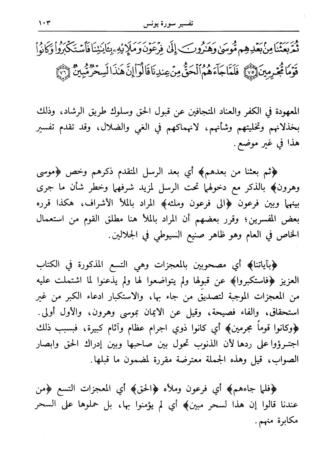 ثُمَّ بَعَثْنَا مِنْ بَعْدِهِمْ مُوسَى وَهَارُونَ إِلَى فِرْعَوْنَ وَمَلَئِهِ بِآيَاتِنَا فَاسْتَكْبَرُوا وَكَانُوا قَوْمًا مُجْرِمِينَ (75) فَلَمَّا جَاءَهُمُ الْحَقُّ مِنْ عِنْدِنَا قَالُوا إِنَّ هَذَا لَسِحْرٌ مُبِينٌ (76)