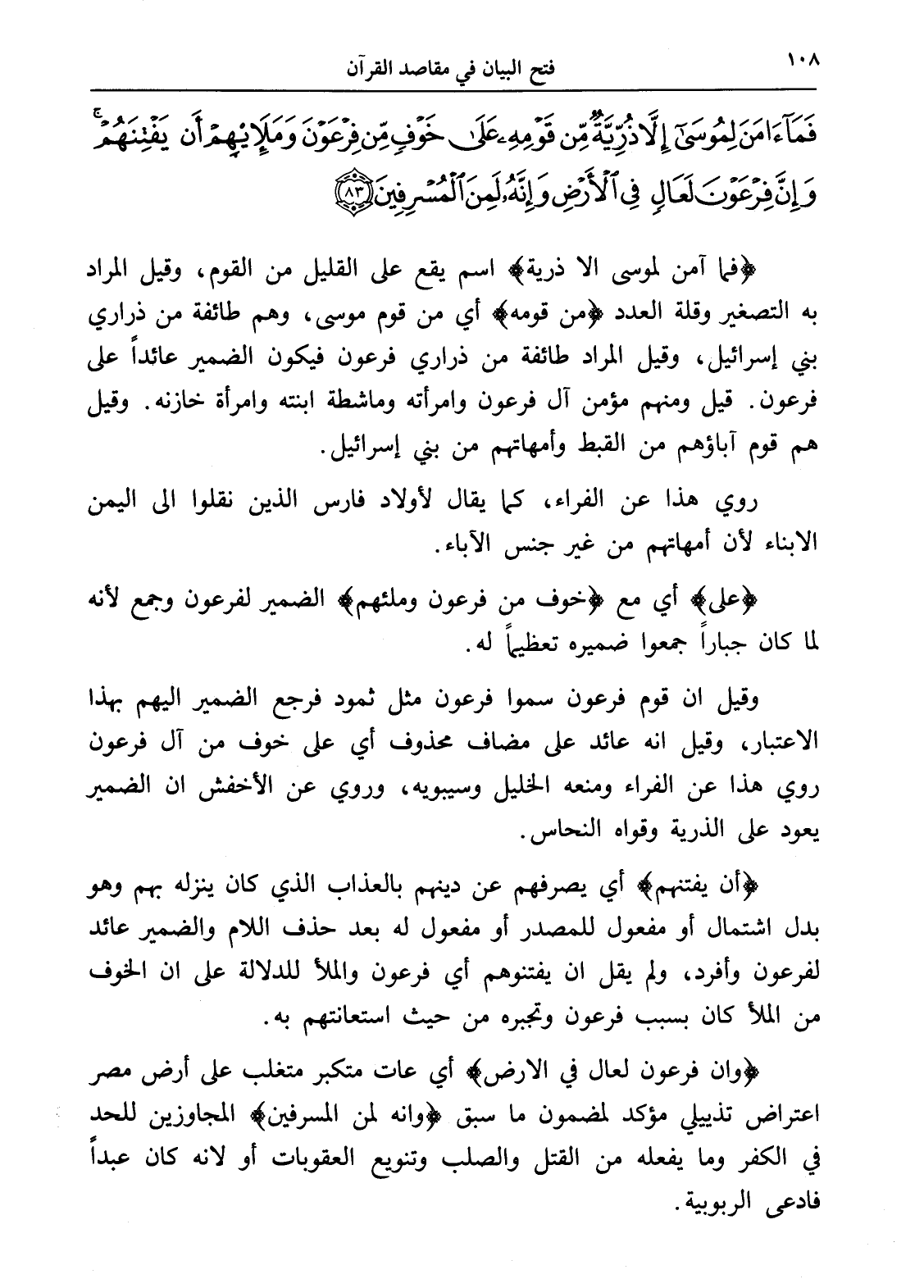 فَمَا آمَنَ لِمُوسَى إِلَّا ذُرِّيَّةٌ مِنْ قَوْمِهِ عَلَى خَوْفٍ مِنْ فِرْعَوْنَ وَمَلَئِهِمْ أَنْ يَفْتِنَهُمْ وَإِنَّ فِرْعَوْنَ لَعَالٍ فِي الْأَرْضِ وَإِنَّهُ لَمِنَ الْمُسْرِفِينَ (83)