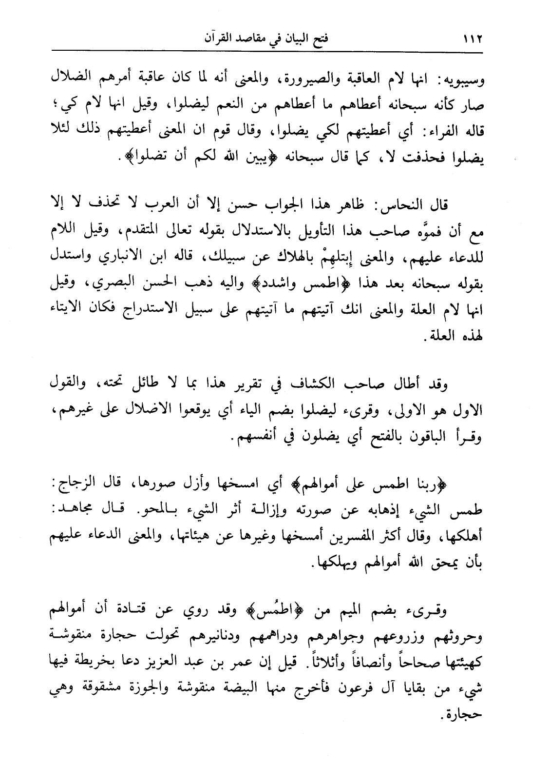 قال النحاس: ظاهر هذا الجواب حسن إلا أن العرب لا تحذف لا إلا مع أن فموَّه صاحب هذا التأويل بالاستدلال بقوله تعالى المتقدم، وقيل اللام للدعاء عليهم، والمعنى إِبتلهِمْ بالهلاك عن سبيلك، قاله ابن الأنباري واستدل بقوله سبحانه بعد هذا (اطمس) و (اشدد) وإليه ذهب الحسن البصري، وقيل أنها لام العلة والمعنى إنك آتيتهم ما آتيتهم على سبيل الاستدراج فكان الإيتاء لهذه العلة.