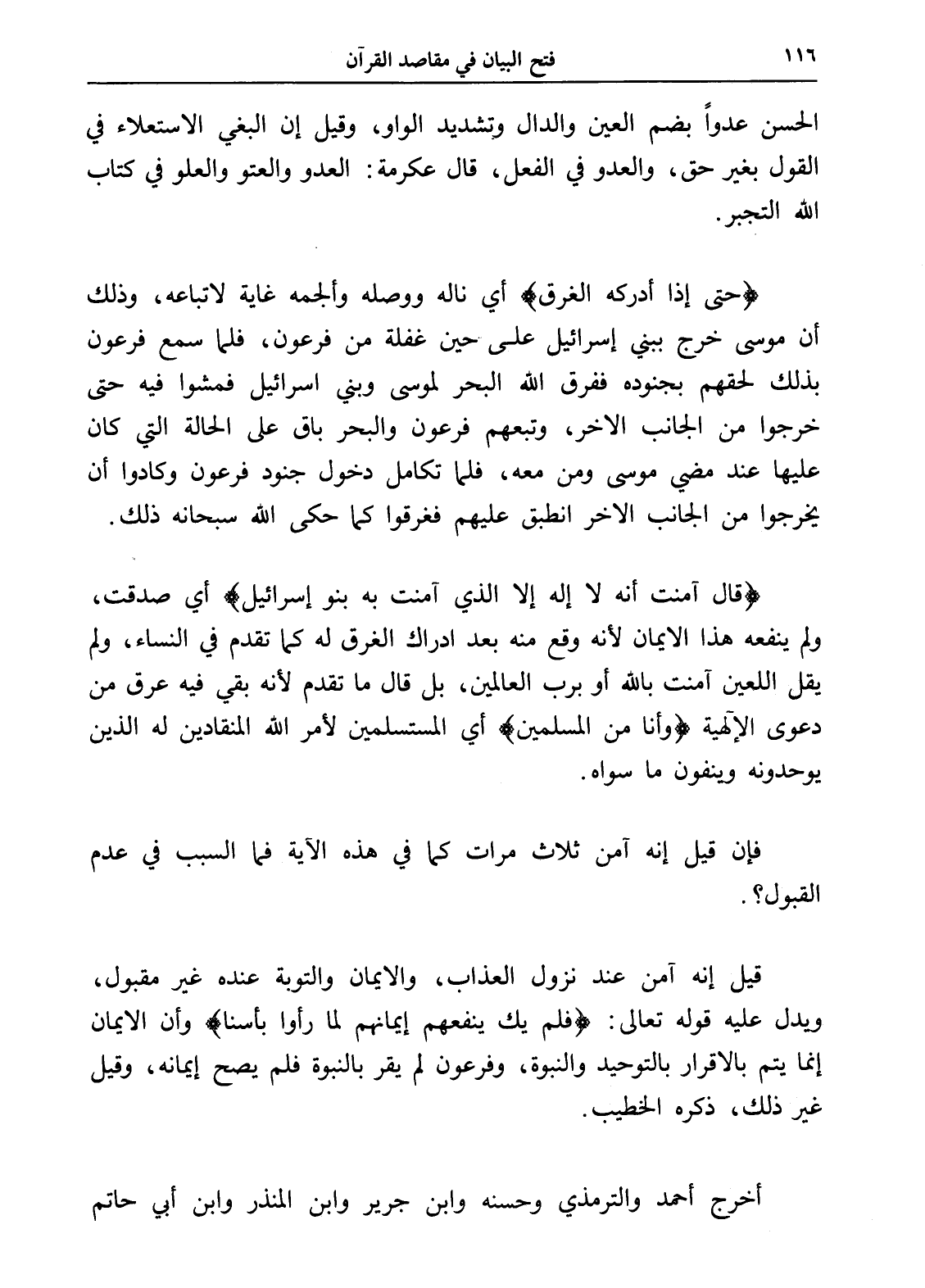 قيل إنه آمن عند نزول العذاب، والإيمان والتوبة عنده غير مقبول، ويدل عليه قوله تعالى: (فلم يك ينفعهم إيمانهم لما رأوا بأسنا) وأن الإيمان إنما يتم بالإقرار بالتوحيد والنبوة، وفرعون لم يقر بالنبوة فلم يصح إيمانه، وقيل غير ذلك، ذكره الخطيب.