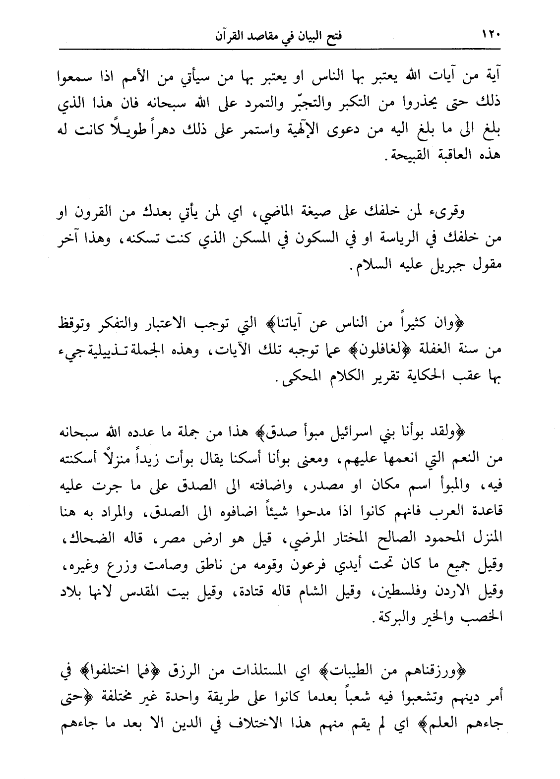(ولقد بوأنا بني إسرائيل مبوأ صدق) هذا من جملة ما عدده الله سبحانه من النعم التي أنعمها عليهم، ومعنى بوأنا أسكنا يقال بوأت زيداً منزلاً أسكنته فيه، والمبوأ اسم مكان أو مصدر، وإضافته إلى الصدق على ما جرت عليه قاعدة العرب فإنهم كانوا إذا مدحوا شيئاً أضافوه إلى الصدق، والمراد به هنا المنزل المحمود الصالح المختار المرضي، قيل هو أرض مصر، قاله الضحاك، وقيل جميع ما كان تحت أيدي فرعون وقومه من ناطق وصامت وزرع وغيره، وقيل الأردن وفلسطين، وقيل الشام قاله قتادة، وقيل بيت المقدس لأنها بلاد الخصب والخير والبركة.