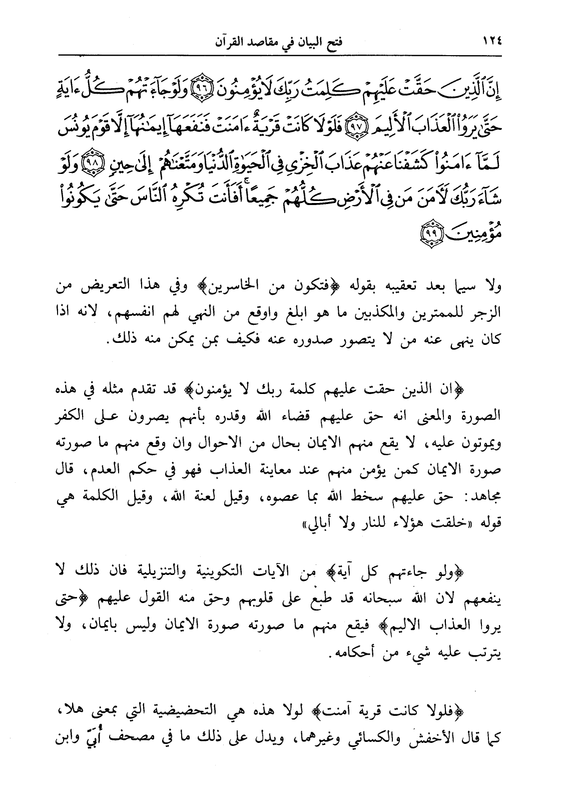 إِنَّ الَّذِينَ حَقَّتْ عَلَيْهِمْ كَلِمَتُ رَبِّكَ لَا يُؤْمِنُونَ (96) وَلَوْ جَاءَتْهُمْ كُلُّ آيَةٍ حَتَّى يَرَوُا الْعَذَابَ الْأَلِيمَ (97) فَلَوْلَا كَانَتْ قَرْيَةٌ آمَنَتْ فَنَفَعَهَا إِيمَانُهَا إِلَّا قَوْمَ يُونُسَ لَمَّا آمَنُوا كَشَفْنَا عَنْهُمْ عَذَابَ الْخِزْيِ فِي الْحَيَاةِ الدُّنْيَا وَمَتَّعْنَاهُمْ إِلَى حِينٍ (98) وَلَوْ شَاءَ رَبُّكَ لَآمَنَ مَنْ فِي الْأَرْضِ كُلُّهُمْ جَمِيعًا أَفَأَنْتَ تُكْرِهُ النَّاسَ حَتَّى يَكُونُوا مُؤْمِنِينَ (99)