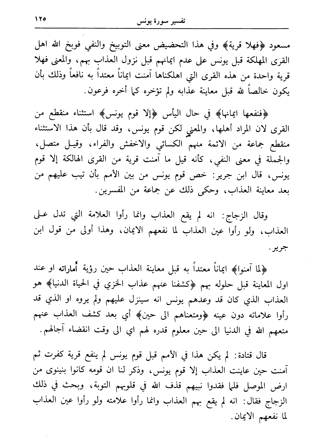 مسعود (فهلا قرية) وفي هذا التحضيض معنى التوبيخ والنفي فوبخ الله أهل القرى المهلكة قبل يونس على عدم إيمانهم قبل نزول العذاب بهم، والمعنى فهلا قرية واحدة من هذه القرى التي أهلكناها آمنت إيماناً معتداً به نافعاً وذلك بأن يكون خالصاً لله قبل معاينة عذابه ولم تؤخره كما أخره فرعون.
