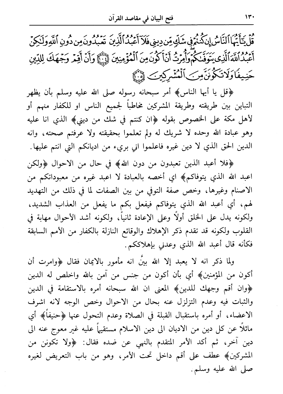 قُلْ يَا أَيُّهَا النَّاسُ إِنْ كُنْتُمْ فِي شَكٍّ مِنْ دِينِي فَلَا أَعْبُدُ الَّذِينَ تَعْبُدُونَ مِنْ دُونِ اللَّهِ وَلَكِنْ أَعْبُدُ اللَّهَ الَّذِي يَتَوَفَّاكُمْ وَأُمِرْتُ أَنْ أَكُونَ مِنَ الْمُؤْمِنِينَ (104) وَأَنْ أَقِمْ وَجْهَكَ لِلدِّينِ حَنِيفًا وَلَا تَكُونَنَّ مِنَ الْمُشْرِكِينَ (105)
