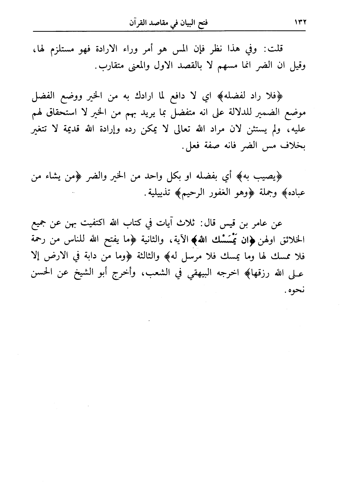 قلت: وفي هذا نظر فإن المس هو أمر وراء الإرادة فهو مستلزم لها، وقيل أن الضر إنما مسهم لا بالقصد الأول والمعنى متقارب.