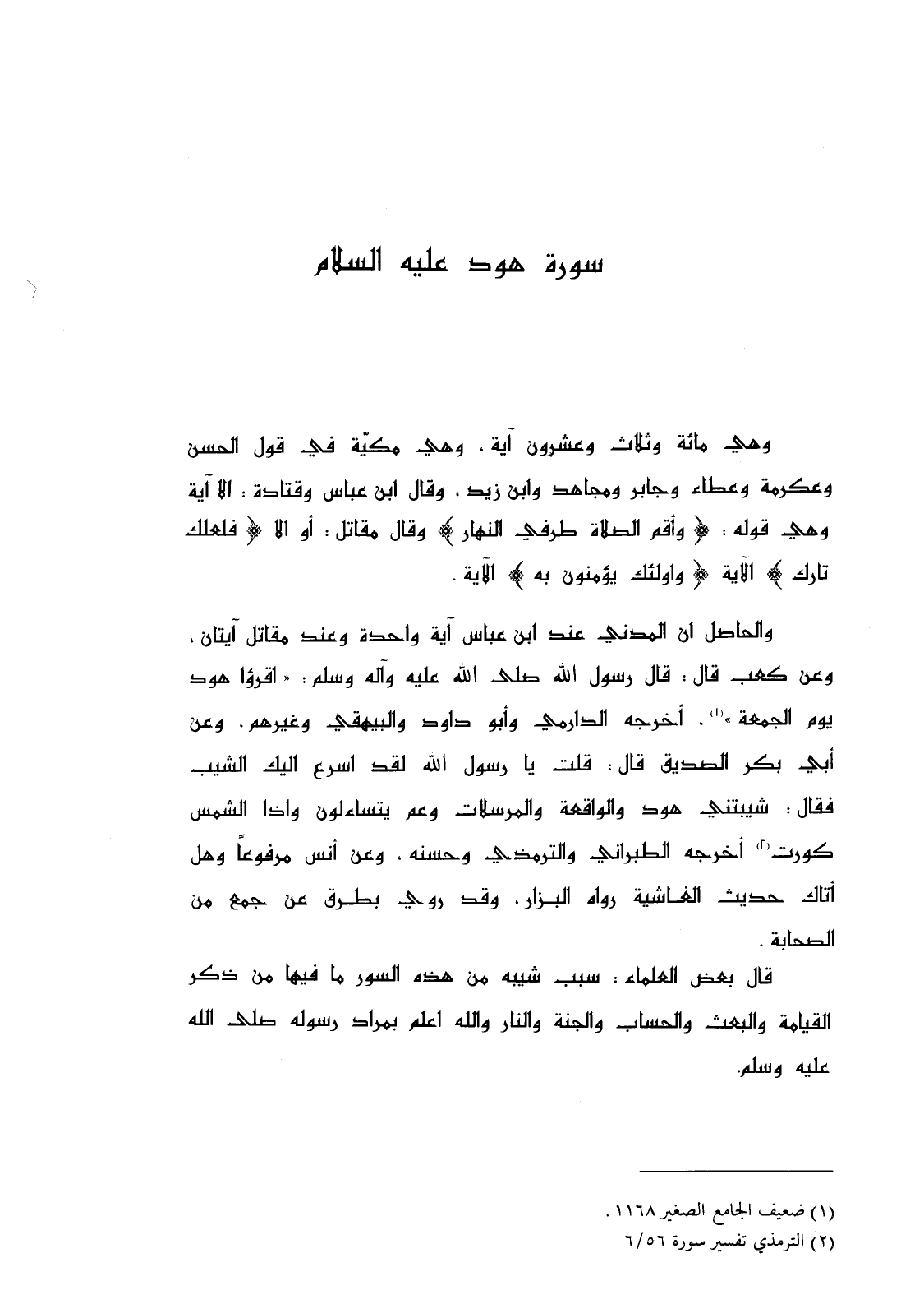 وعن كعب قال: قال رسول الله صلى لله عليه وآله وسلم: " اقرؤا هود يوم الجمعة " (¬1). أخرجه الدارمي وأبو داود والبيهقي وغيرهم، وعن أبي بكر الصديق قال: قلت يا رسول الله لقد أسرع إليك الشيب فقال: " شيبتني هود والواقعة والمرسلات وعم يتساءلون وإذا الشمس كورت " (¬2) أخرجه الطبراني والترمذي وحسنه. وعن أنس مرفوعاً وهل أتاك حديث الغاشية رواه البزار، وقد روي بطرق عن جمع من الصحابة.