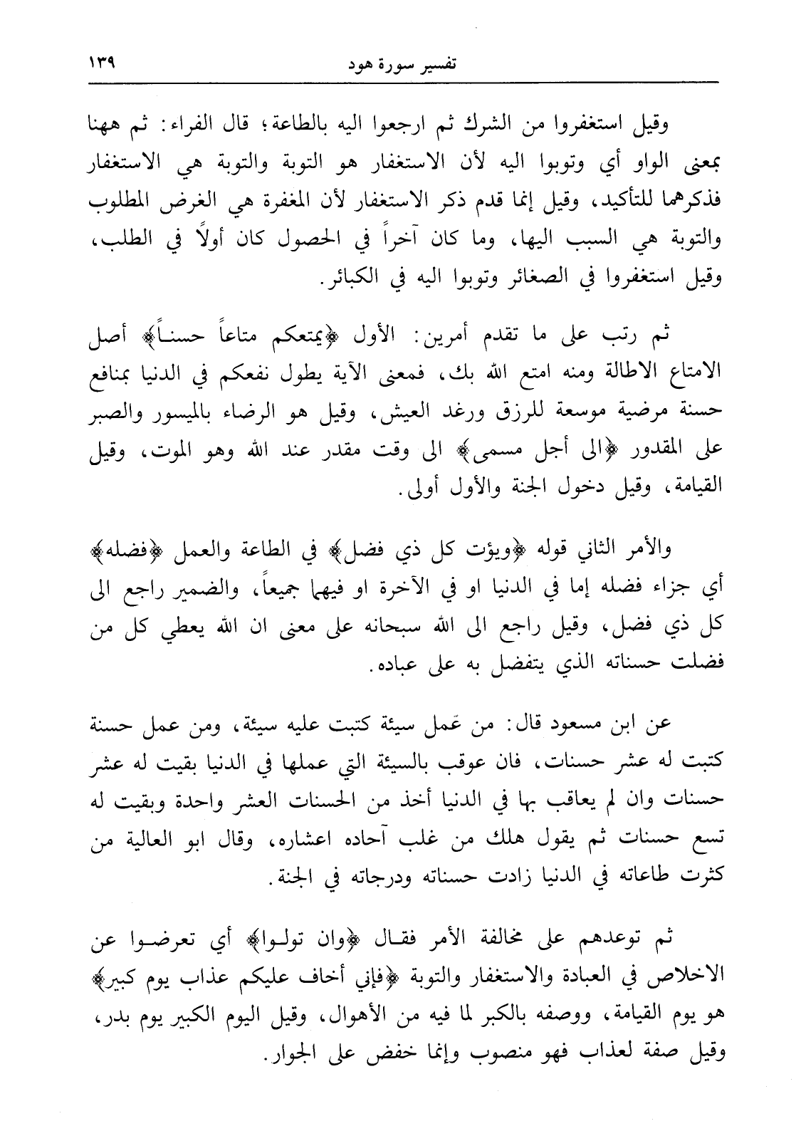 ثم توعدهم على مخالفة الأمر فقال (وإن تولوا) أي تعرضوا عن الإخلاص في العبادة والاستغفار والتوبة (فإني أخاف عليكم عذاب يوم كبير) هو يوم القيامة، ووصفه بالكبر لما فيه من الأهوال، وقيل اليوم الكبير يوم بدر، وقيل صفة لعذاب فهو منصوب وإنما خفض على الجوار.