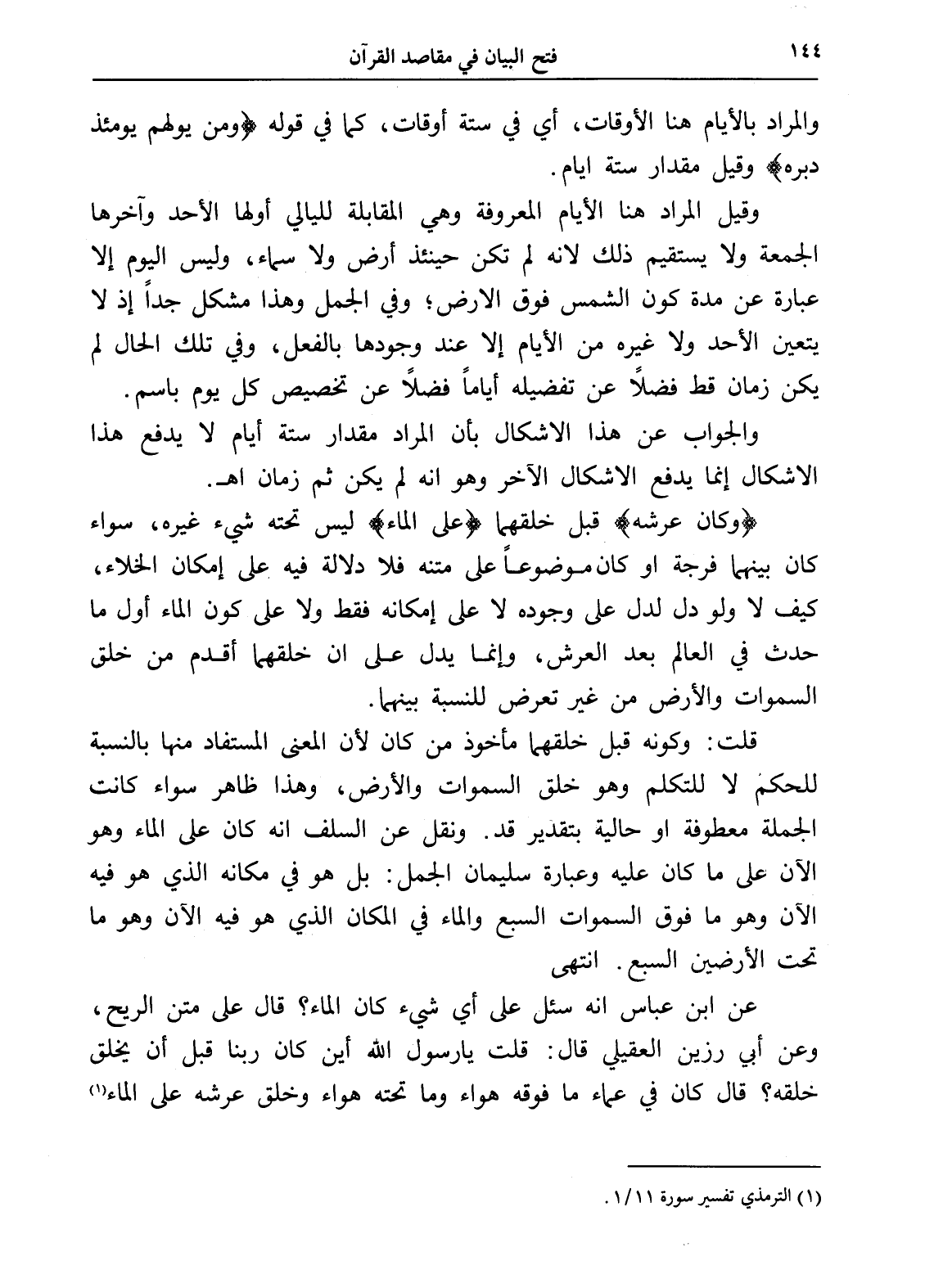 وقيل المراد هنا الأيام المعروفة وهي المقابلة لليالي أولها الأحد وآخرها الجمعة ولا يستقيم ذلك لأنه لم تكن حينئذ أرض ولا سماء، وليس اليوم إلا عبارة عن مدة كون الشمس فوق الأرض؛ وفي الجمل وهذا مشكل جداً إذ لا يتعين الأحد ولا غيره من الأيام إلا عند وجودها بالفعل، وفي تلك الحال لم يكن زمان قط فضلاً عن تفضيله أياماً فضلاً عن تخصيص كل يوم باسم.