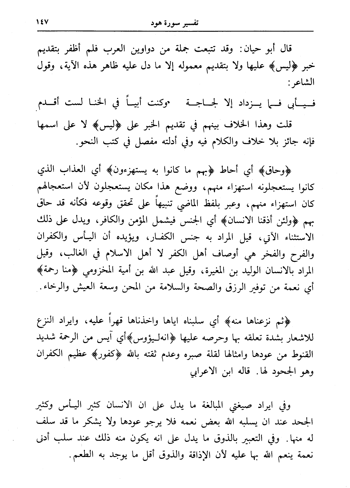 (ثم نزعناها منه) أي سلبناه إياها وأخذناها قهراً عليه، وإيراد النزع للإشعار بشدة تعلقه بها وحرصه عليها (إنه ليؤوس) أي آيس من الرحمة شديد القنوط من عودها وأمثالها لقلة صبره وعدم ثقته بالله (كفور) عظيم الكفران وهو الجحود لها. قاله ابن الأعرابي