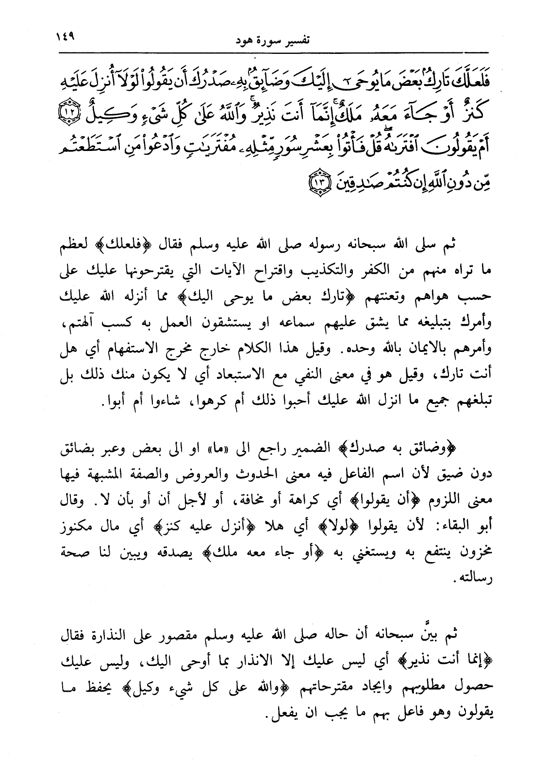 فَلَعَلَّكَ تَارِكٌ بَعْضَ مَا يُوحَى إِلَيْكَ وَضَائِقٌ بِهِ صَدْرُكَ أَنْ يَقُولُوا لَوْلَا أُنْزِلَ عَلَيْهِ كَنْزٌ أَوْ جَاءَ مَعَهُ مَلَكٌ إِنَّمَا أَنْتَ نَذِيرٌ وَاللَّهُ عَلَى كُلِّ شَيْءٍ وَكِيلٌ (12) أَمْ يَقُولُونَ افْتَرَاهُ قُلْ فَأْتُوا بِعَشْرِ سُوَرٍ مِثْلِهِ مُفْتَرَيَاتٍ وَادْعُوا مَنِ اسْتَطَعْتُمْ مِنْ دُونِ اللَّهِ إِنْ كُنْتُمْ صَادِقِينَ (13)