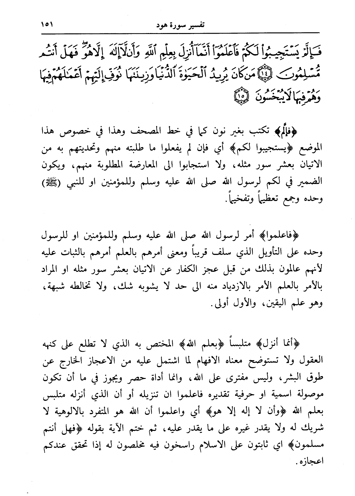(فإلَّم) تكتب بغير نون كما في خط المصحف وهذا في خصوص هذا الموضع (يستجيبوا لكم) أي فإن لم يفعلوا ما طلبته منهم وتحديتهم به من الإتيان بعشر سور مثله، ولا استجابوا إلى المعارضة المطلوبة منهم، ويكون الضمير في لكم لرسول الله صلى الله عليه وسلم وللمؤمنين أو للنبي (- صلى الله عليه وسلم -) وحده وجمع تعظيماً وتفخيماً.