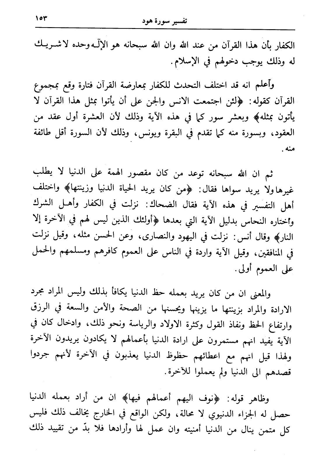 وظاهر قوله: (نوف إليهم أعمالهم فيها) أن من أراد بعمله الدنيا حصل له الجزاء الدنيوي لا محالة، ولكن الواقع في الخارج يخالف ذلك فليس كل متمن ينال من الدنيا أمنيته وإن عمل لها وأرادها فلا بدّ من تقييد ذلك