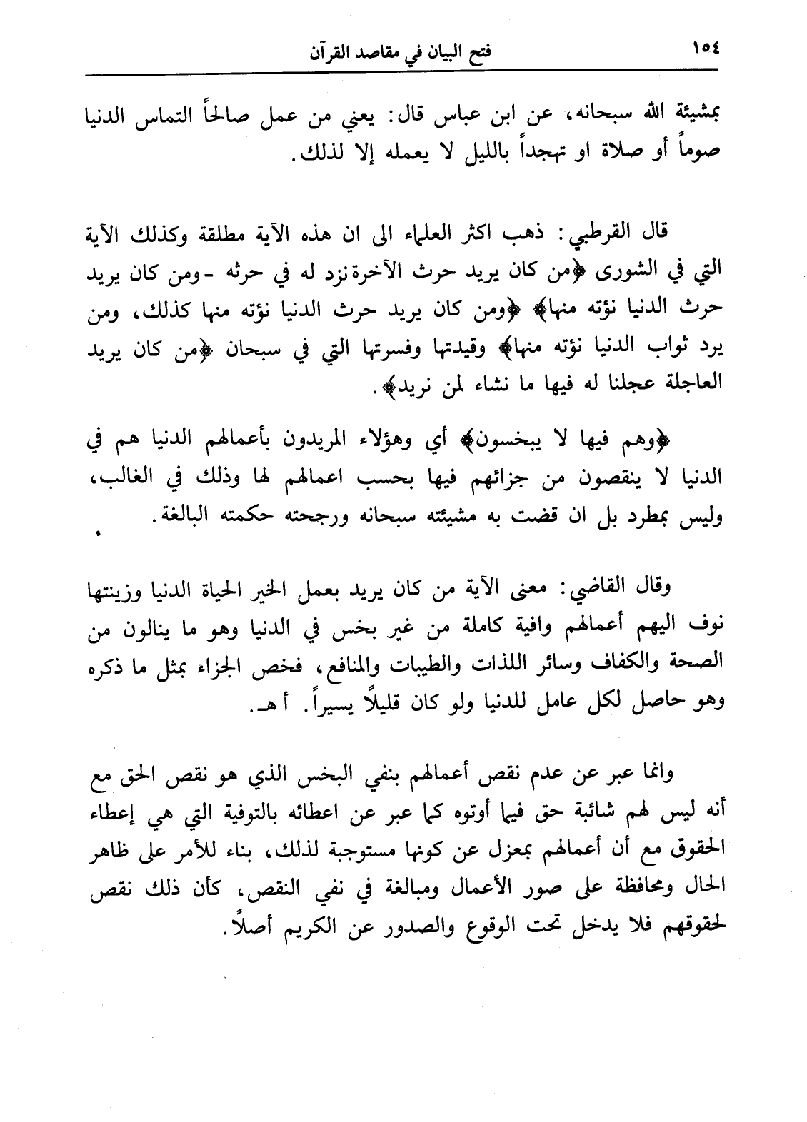 بمشيئة الله سبحانه، عن ابن عباس قال: يعني من عمل صالحاً التماس الدنيا صوماً أو صلاة أو تهجداً بالليل لا يعمله إلا لذلك.