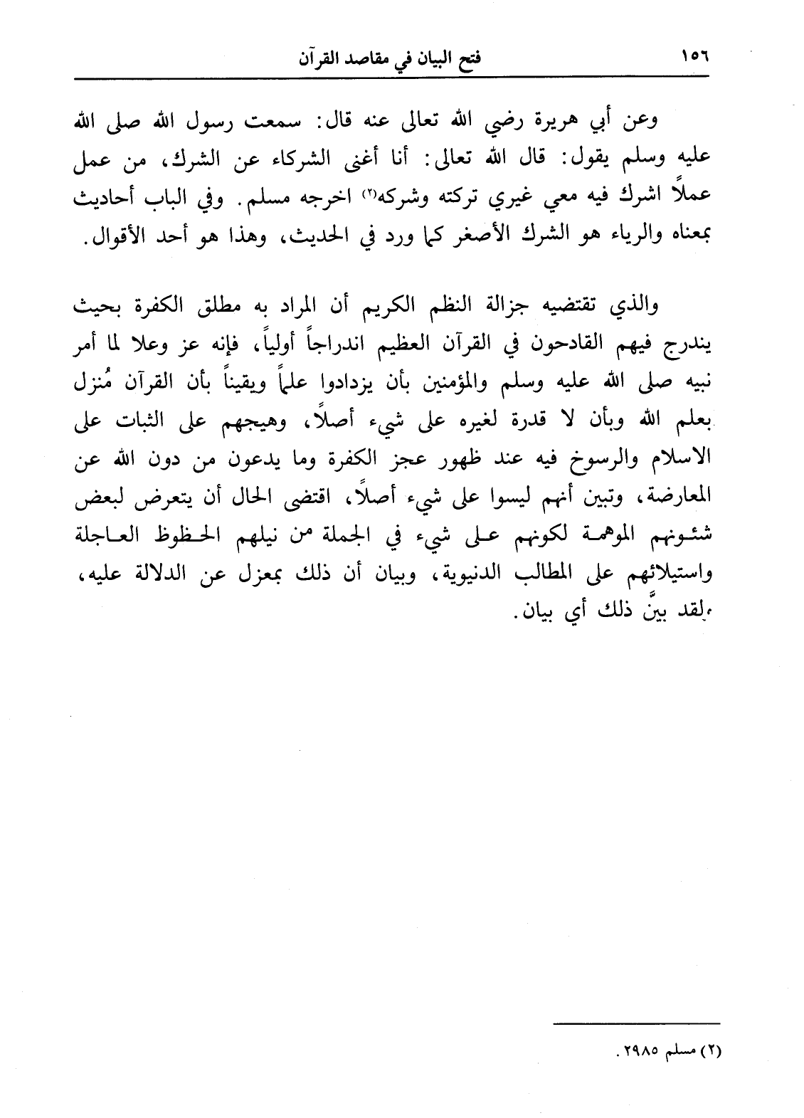 وعن أبي هريرة رضي الله تعالى عنه قال: سمعت رسول الله صلى الله عليه وسلم يقول: قال الله تعالى: أنا أغنى الشركاء عن الشرك، من عمل عملاً أشرك فيه معي غيري تركته وشركه (¬1) أخرجه مسلم. وفي الباب أحاديث بمعناه والرياء هو الشرك الأصغر كما ورد في الحديث، وهذا هو أحد الأقوال.
