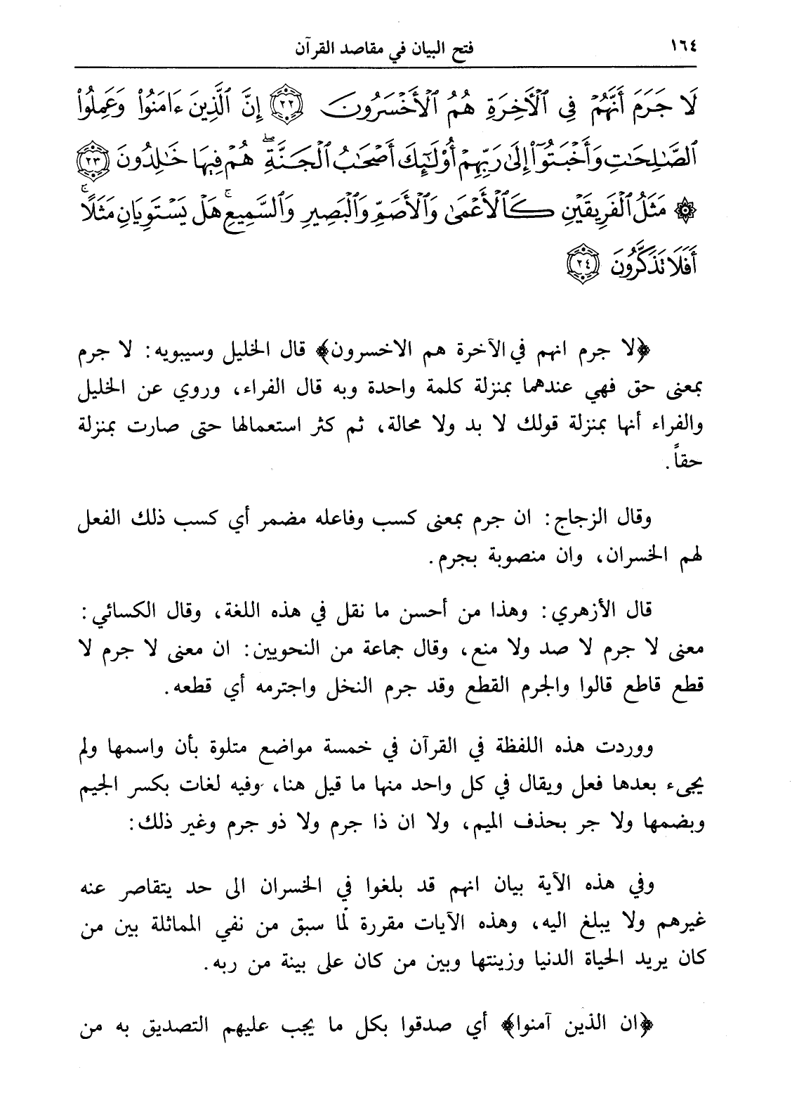 لَا جَرَمَ أَنَّهُمْ فِي الْآخِرَةِ هُمُ الْأَخْسَرُونَ (22) إِنَّ الَّذِينَ آمَنُوا وَعَمِلُوا الصَّالِحَاتِ وَأَخْبَتُوا إِلَى رَبِّهِمْ أُولَئِكَ أَصْحَابُ الْجَنَّةِ هُمْ فِيهَا خَالِدُونَ (23) مَثَلُ الْفَرِيقَيْنِ كَالْأَعْمَى وَالْأَصَمِّ وَالْبَصِيرِ وَالسَّمِيعِ هَلْ يَسْتَوِيَانِ مَثَلًا أَفَلَا تَذَكَّرُونَ (24)