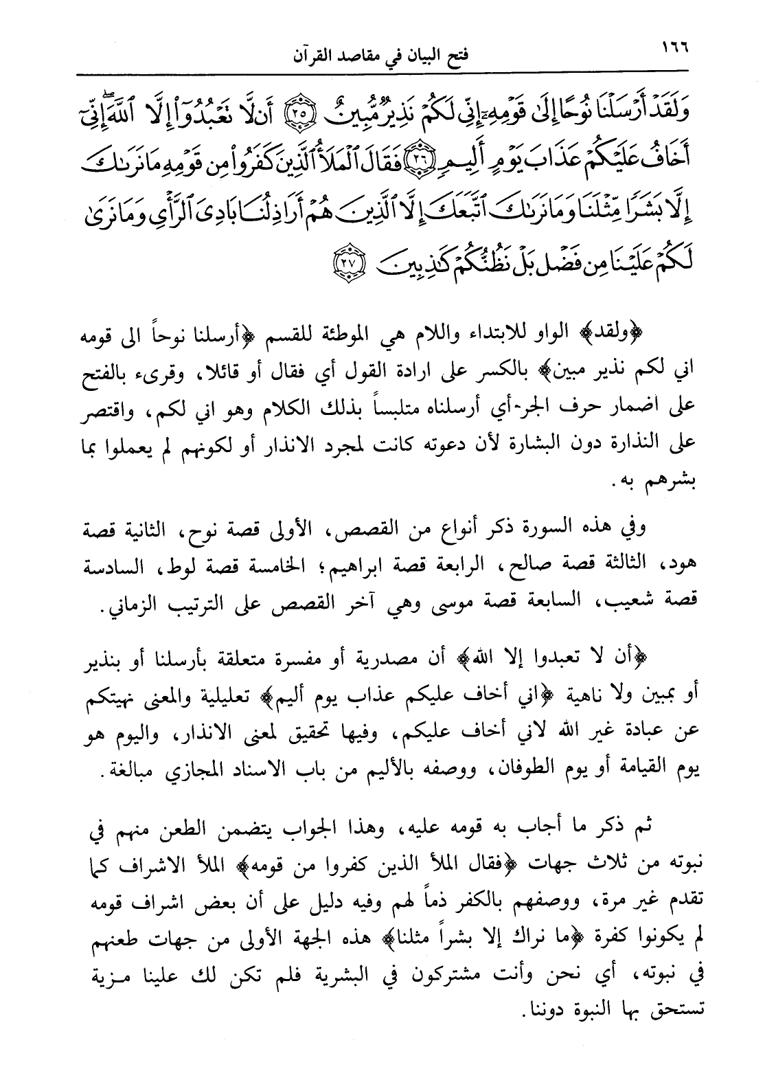 وَلَقَدْ أَرْسَلْنَا نُوحًا إِلَى قَوْمِهِ إِنِّي لَكُمْ نَذِيرٌ مُبِينٌ (25) أَنْ لَا تَعْبُدُوا إِلَّا اللَّهَ إِنِّي أَخَافُ عَلَيْكُمْ عَذَابَ يَوْمٍ أَلِيمٍ (26) فَقَالَ الْمَلَأُ الَّذِينَ كَفَرُوا مِنْ قَوْمِهِ مَا نَرَاكَ إِلَّا بَشَرًا مِثْلَنَا وَمَا نَرَاكَ اتَّبَعَكَ إِلَّا الَّذِينَ هُمْ أَرَاذِلُنَا بَادِيَ الرَّأْيِ وَمَا نَرَى لَكُمْ عَلَيْنَا مِنْ فَضْلٍ بَلْ نَظُنُّكُمْ كَاذِبِينَ (27)