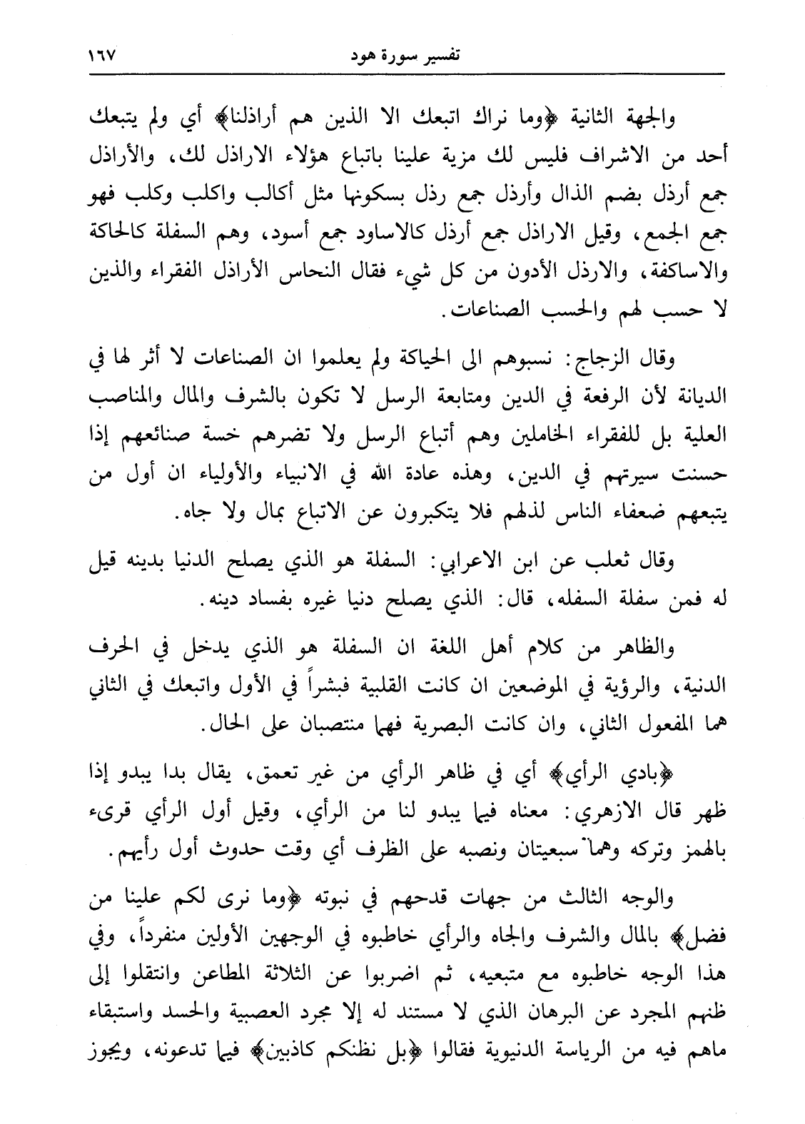 والجهة الثانية (وما نراك اتبعك إلا الذين هم أراذلنا) أي ولم يتبعك أحد من الأشراف فليس لك مزية علينا باتباع هؤلاء الأراذل لك، والأراذل جمع أرذل بضم الذال وأرذل جمع رذل بسكونها مثل أكالب واكلب وكلب فهو جمع الجمع، وقيل الأراذل جمع أرذل كالأساود جمع أسود، وهم السفلة كالحاكة والأساكفة، والأرذل الأدون من كل شيء فقال النحاس الأراذل الفقراء والذين لا حسب لهم والحسب الصناعات.