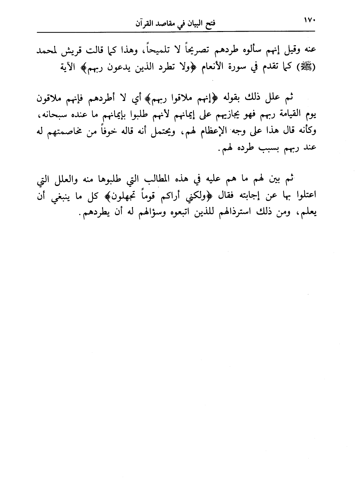 ثم علل ذلك بقوله (إنهم ملاقوا ربهم) أي لا أطردهم فإنهم ملاقون يوم القيامة ربهم فهو يجازيهم على إيمانهم لأنهم طلبوا بإيمانهم ما عنده سبحانه، وكأنه قال هذا على وجه الإعظام لهم، ويحتمل أنه قاله خوفاً من مخاصمتهم له عند ربهم بسبب طرده لهم.