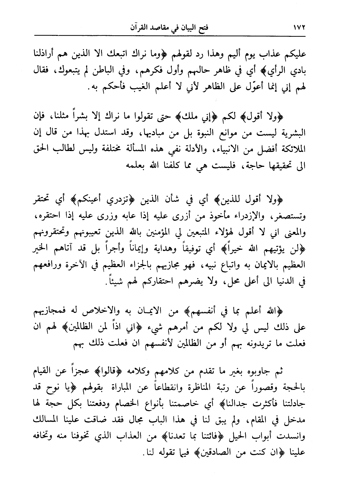 (ولا أقول) لكم (إني ملك) حتى تقولوا ما نراك إلا بشراً مثلنا، فإن البشرية ليست من موانع النبوة بل من مباديها، وقد استدل بهذا من قال إن الملائكة أفضل من الأنبياء، والأدلة نفي هذه المسألة مختلفة وليس لطالب الحق إلى تحقيقها حاجة، فليست هي مما كلفنا الله بعلمه