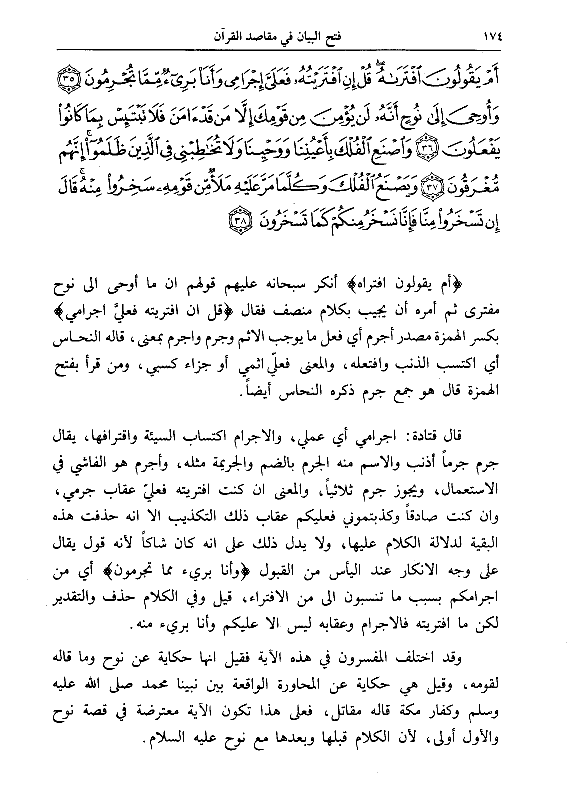 أَمْ يَقُولُونَ افْتَرَاهُ قُلْ إِنِ افْتَرَيْتُهُ فَعَلَيَّ إِجْرَامِي وَأَنَا بَرِيءٌ مِمَّا تُجْرِمُونَ (35) وَأُوحِيَ إِلَى نُوحٍ أَنَّهُ لَنْ يُؤْمِنَ مِنْ قَوْمِكَ إِلَّا مَنْ قَدْ آمَنَ فَلَا تَبْتَئِسْ بِمَا كَانُوا يَفْعَلُونَ (36) وَاصْنَعِ الْفُلْكَ بِأَعْيُنِنَا وَوَحْيِنَا وَلَا تُخَاطِبْنِي فِي الَّذِينَ ظَلَمُوا إِنَّهُمْ مُغْرَقُونَ (37) وَيَصْنَعُ الْفُلْكَ وَكُلَّمَا مَرَّ عَلَيْهِ مَلَأٌ مِنْ قَوْمِهِ سَخِرُوا مِنْهُ قَالَ إِنْ تَسْخَرُوا مِنَّا فَإِنَّا نَسْخَرُ مِنْكُمْ كَمَا تَسْخَرُونَ (38)