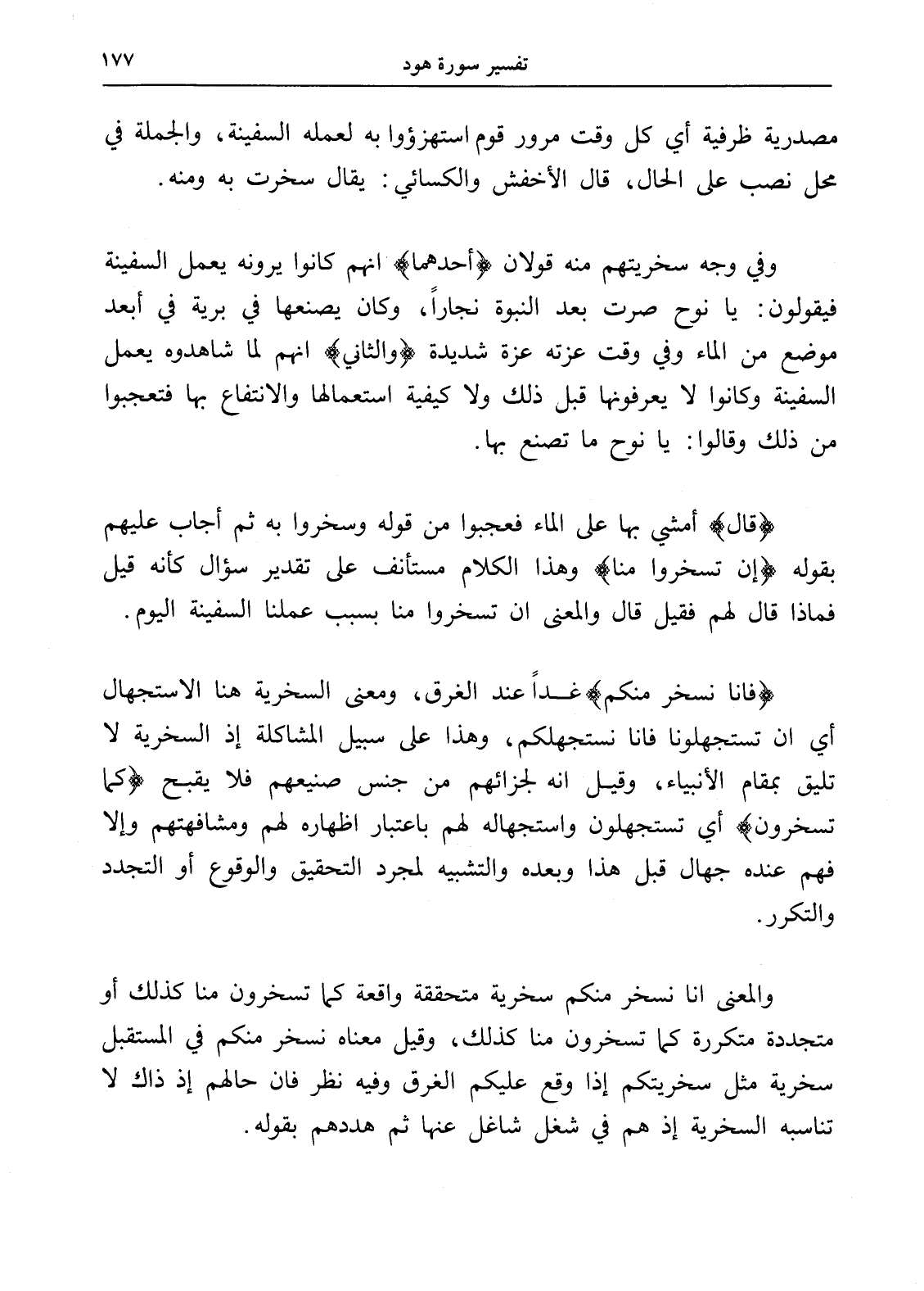 وفي وجه سخريتهم منه قولان (أحدهما) أنهم كانوا يرونه يعمل السفينة فيقولون: يا نوح صرت بعد النبوة نجاراً، وكان يصنعها في برية في أبعد موضع من الماء وفي وقت عزته عزة شديدة (والثاني) أنهم لما شاهدوه يعمل السفينة وكانوا لا يعرفونها قبل ذلك ولا كيفية استعمالها والانتفاع بها فتعجبوا من ذلك وقالوا: يا نوح ما تصنع بها.