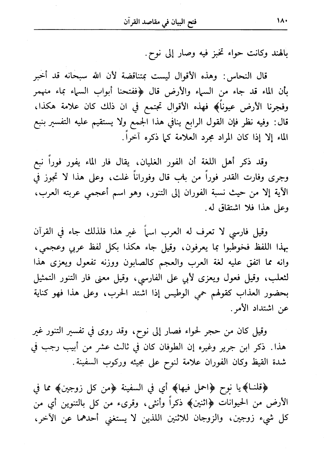 وقيل فارسي لا تعرف له العرب اسماً غير هذا فلذلك جاء في القرآن بهذا اللفظ فخوطبوا بما يعرفون، وقيل جاء هكذا بكل لفظ عربي وعجمي، وأنه مما اتفق عليه لغة العرب والعجم كالصابون ووزنه تفعول ويعزى هذا لثعلب، وقيل فعول ويعزى لأبي على الفارسي، وقيل معنى فار التنور التمثيل بحضور العذاب كقولهم حمي الوطيس إذا اشتد الحرب، وعلى هذا فهو كناية عن اشتداد الأمر.