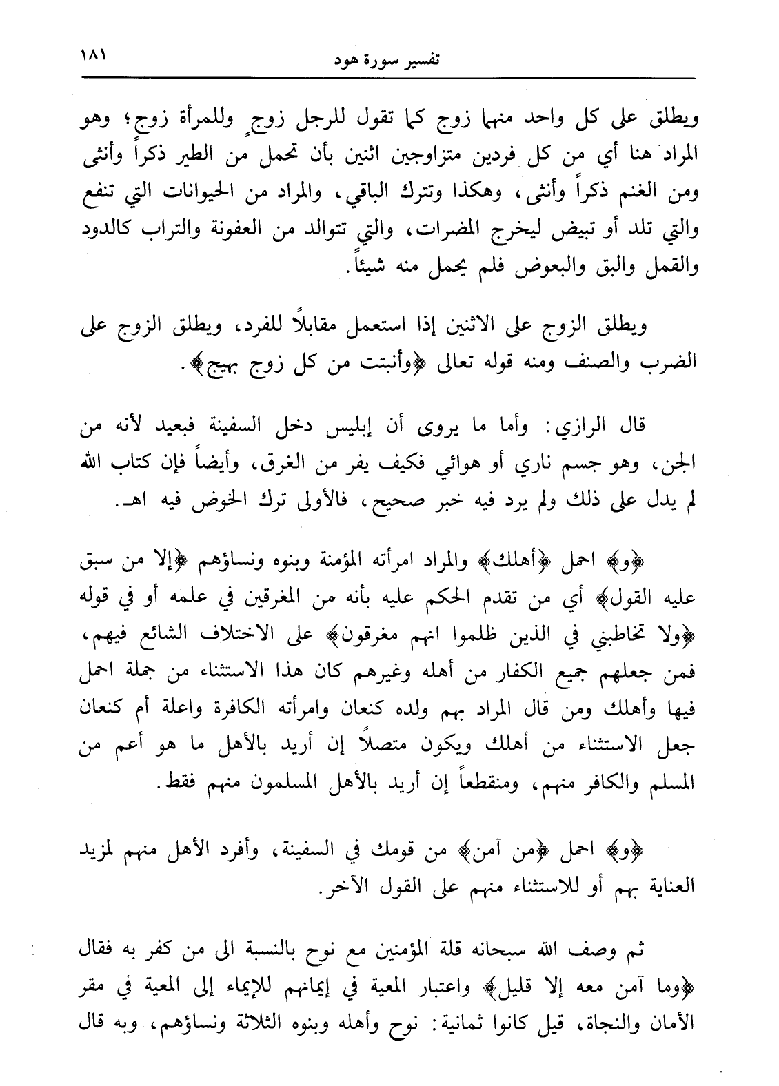 قال الرازي: وأما ما يروى أن إبليس دخل السفينة فبعيد لأنه من الجن، وهو جسم ناري أو هوائي فكيف يفر من الغرق، وأيضاً فإن كتاب الله لم يدل على ذلك ولم يرد فيه خبر صحيح، فالأولى ترك الخوض فيه اهـ.
