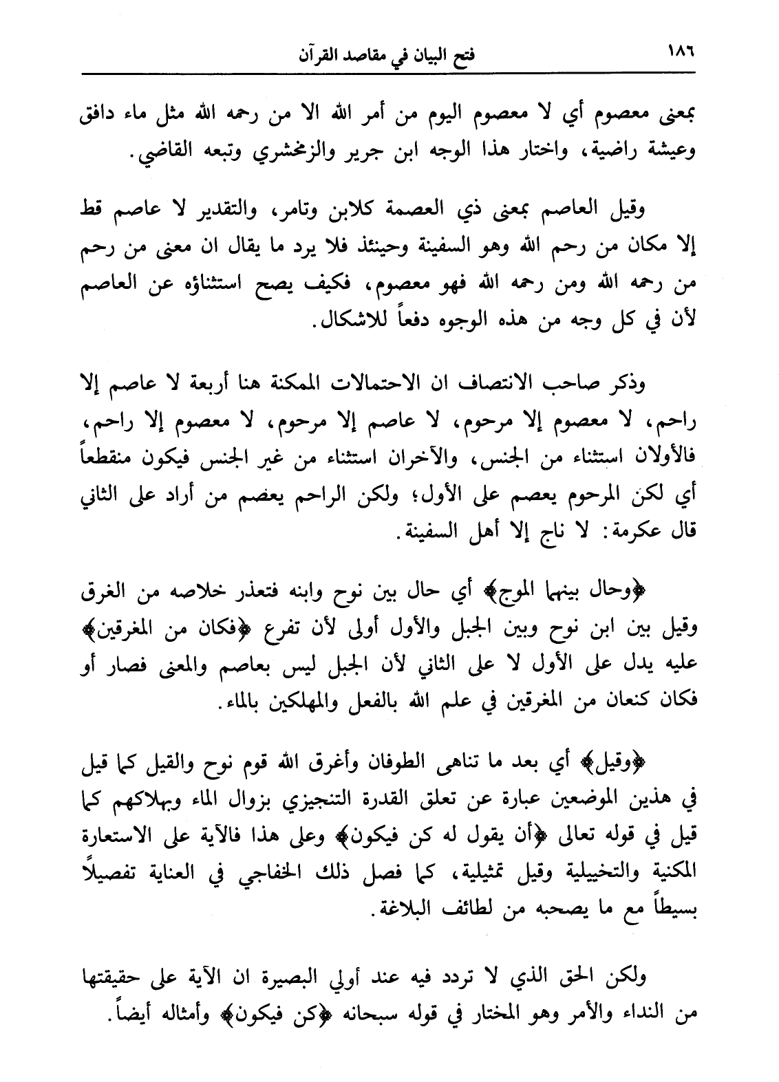 وقيل العاصم بمعنى ذي العصمة كلابن وتامر، والتقدير لا عاصم قط إلا مكان من رحم الله وهو السفينة وحينئذ فلا يرد ما يقال أن معنى من رحم من رحمه الله ومن رحمه الله فهو معصوم، فكيف يصح استثناؤه عن العاصم لأن في كل وجه من هذه الوجوه دفعاً للإشكال.