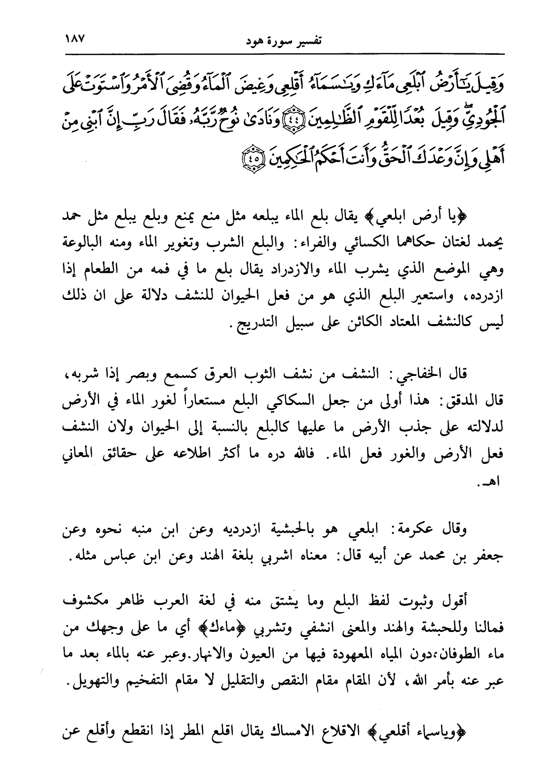 أقول وثبوت لفظ البلع وما يشتق منه في لغة العرب ظاهر مكشوف فمالنا وللحبشة والهند والمعنى انشفي وتشربي (ماءك) أي ما على وجهك من ماء الطوفان دون المياه المعهودة فيها من العيون والأنهار. وعبر عنه بالماء بعد ما عبر عنه بأمر الله، لأن المقام مقام النقص والتقليل لا مقام التفخيم والتهويل.