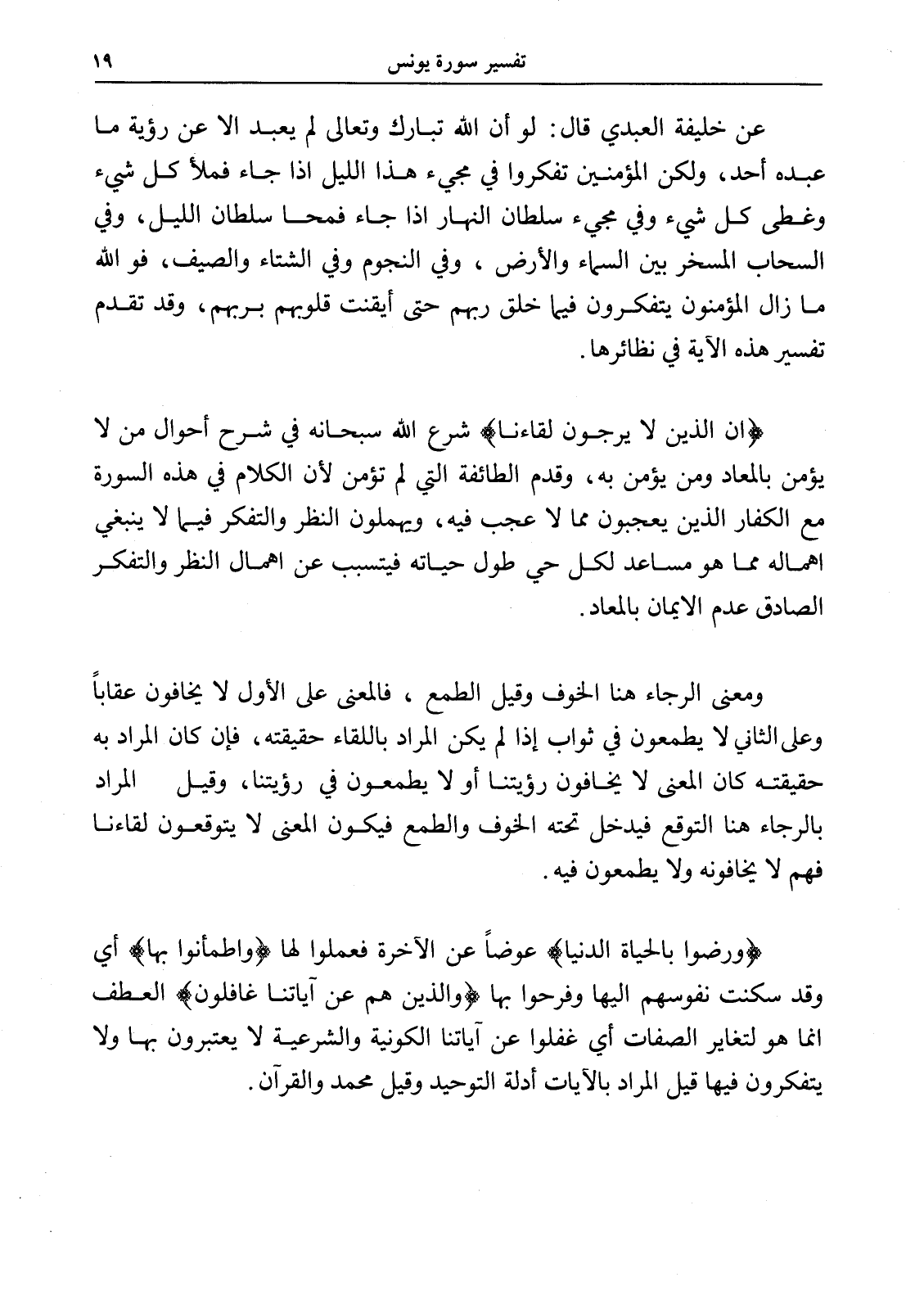 (إن الذين لا يرجون لقاءنا) شرع الله سبحانه في شرح أحوال من لا يؤمن بالمعاد ومن يؤمن به، وقدم الطائفة التي لم تؤمن لأن الكلام في هذه السورة مع الكفار الذين يعجبون مما لا عجب فيه، ويهملون النظر والتفكر فيما لا ينبغي إهماله مما هو مساعد لكل حي طول حياته فيتسبب عن إهمال النظر والتفكر الصادق عدم الإيمان بالمعاد.