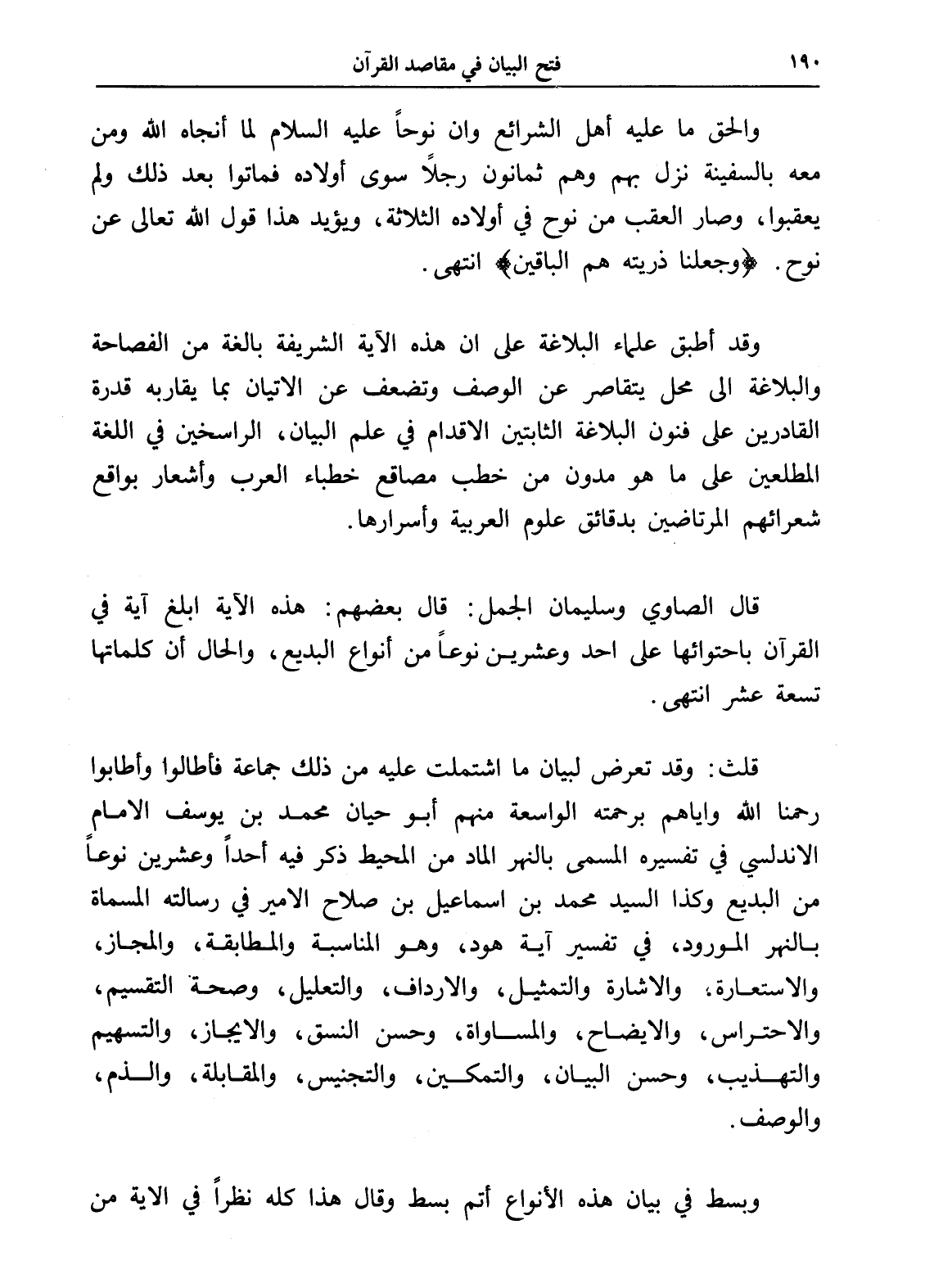 قلت: وقد تعرض لبيان ما اشتملت عليه من ذلك جماعة فأطالوا وأطابوا رحمنا الله وإياهم برحمته الواسعة منهم أبو حيان محمد بن يوسف الإمام الأندلسي في تفسيره المسمى بالنهر الماد من المحيط ذكر فيه أحداً وعشرين نوعاً من البديع وكذا السيد محمد بن أسماعيل بن صلاح الأمير في رسالته المسماة بالنهر المورود، في تفسير آية هود، وهو المناسبة والمطابقة، والمجاز، والاستعارة، والإشارة والتمثيل، والأرداف، والتعليل، وصحة التقسيم، والاحتراس، والإيضاح، والمساواة، وحسن النسق، والإيجاز، والتسهيم والتهذيب، وحسن البيان، والتمكين، والتجنيس، والمقابلة، والذم، والوصف.
