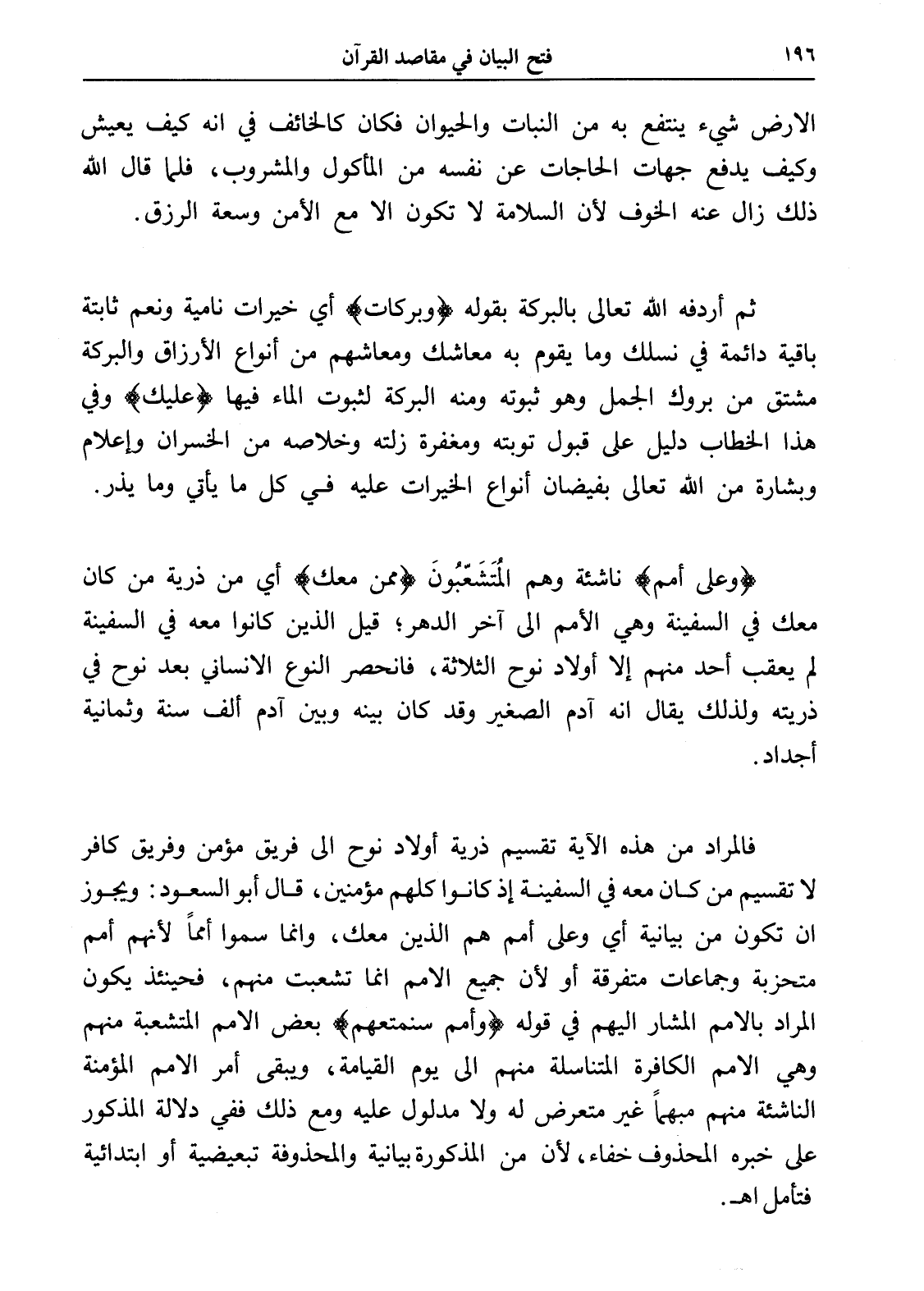 فالمراد من هذه الآية تقسيم ذرية أولاد نوح إلى فريق مؤمن وفريق كافر لا تقسيم من كان معه في السفينة إذ كانوا كلهم مؤمنين، قال أبو السعود: ويجوز أن تكون من بيانية أي وعلى أمم هم الذين معك، وإنما سموا أمماً لأنهم أمم متحزبة وجماعات متفرقة أو لأن جميع الأمم إنما تشعبت منهم، فحينئذ يكون المراد بالأمم المشار إليهم في قوله (وأمم سنمتعهم) بعض الأمم المتشعبة منهم وهي الأمم الكافرة المتناسلة منهم إلى يوم القيامة، ويبقى أمر الأمم المؤمنة الناشئة منهم مبهماً غير متعرض له ولا مدلول عليه ومع ذلك ففي دلالة المذكور على خبره المحذوف خفاء، لأن من المذكورة بيانية والمحذوفة تبعيضية أو ابتدائية فتأمل اهـ.