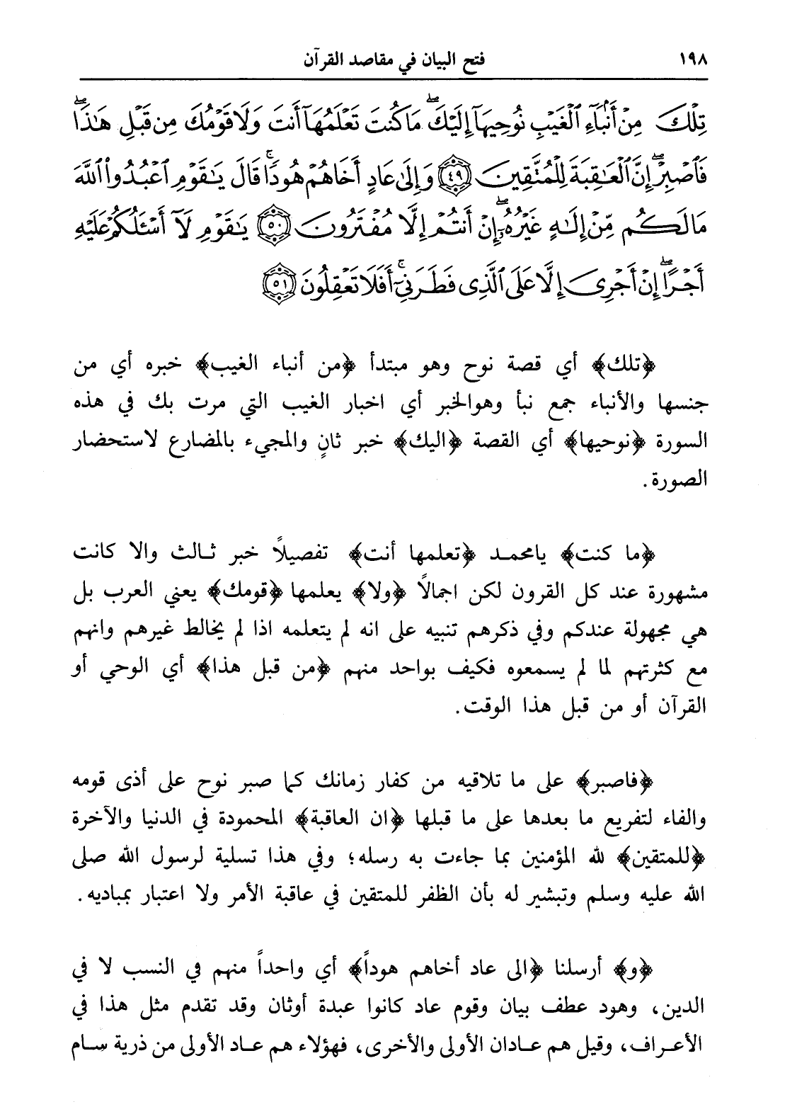 تِلْكَ مِنْ أَنْبَاءِ الْغَيْبِ نُوحِيهَا إِلَيْكَ مَا كُنْتَ تَعْلَمُهَا أَنْتَ وَلَا قَوْمُكَ مِنْ قَبْلِ هَذَا فَاصْبِرْ إِنَّ الْعَاقِبَةَ لِلْمُتَّقِينَ (49) وَإِلَى عَادٍ أَخَاهُمْ هُودًا قَالَ يَا قَوْمِ اعْبُدُوا اللَّهَ مَا لَكُمْ مِنْ إِلَهٍ غَيْرُهُ إِنْ أَنْتُمْ إِلَّا مُفْتَرُونَ (50) يَا قَوْمِ لَا أَسْأَلُكُمْ عَلَيْهِ أَجْرًا إِنْ أَجْرِيَ إِلَّا عَلَى الَّذِي فَطَرَنِي أَفَلَا تَعْقِلُونَ (51)